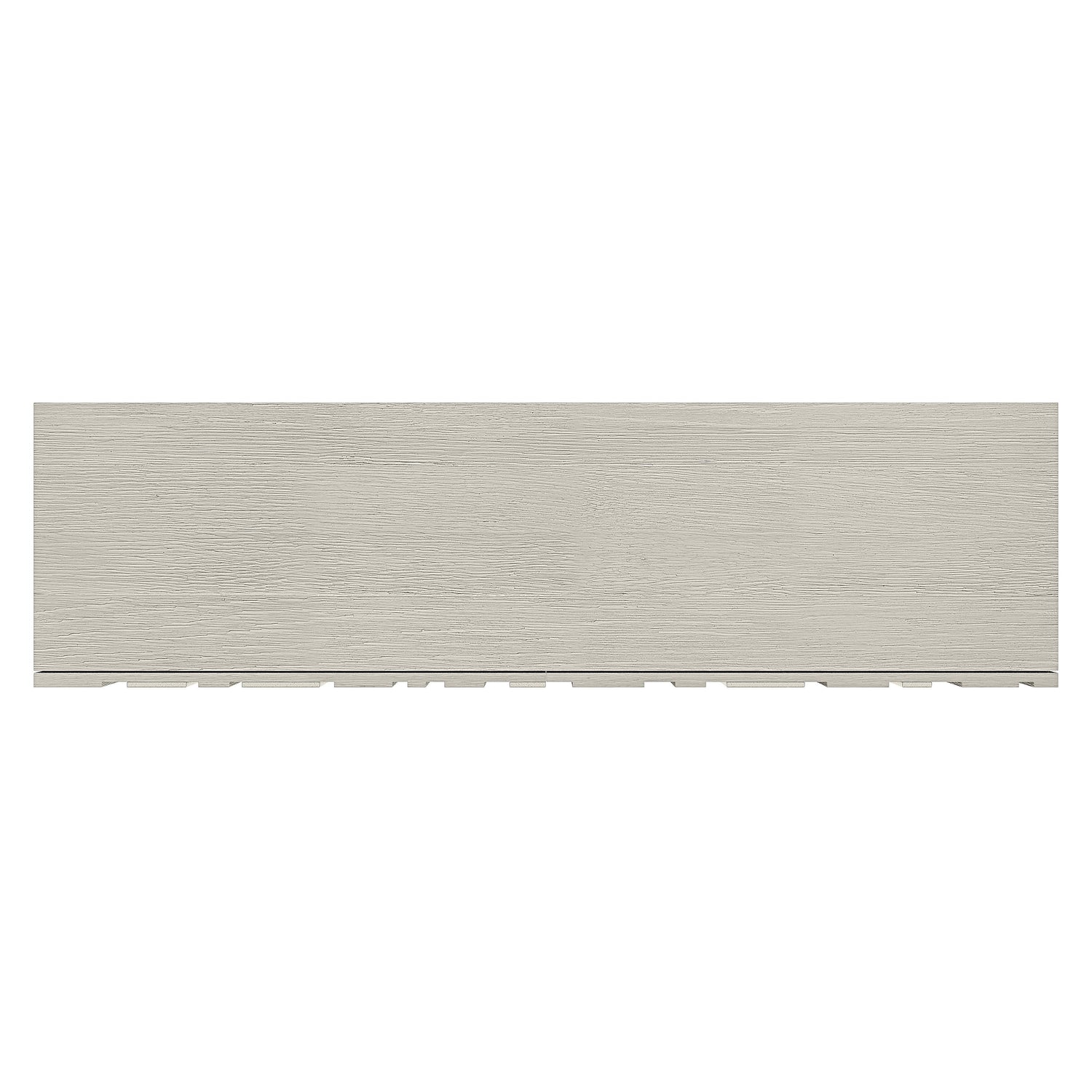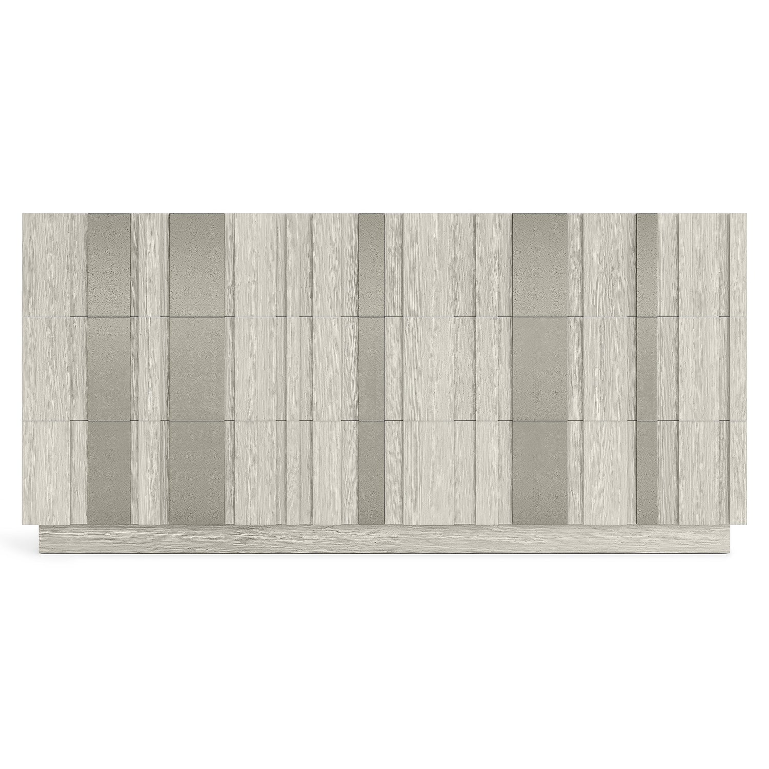 - Wirebrushed oak in Larza finish with smooth top and raised panel drawer fronts with random sandblasted aluminum overlays in Satin Nickel finish