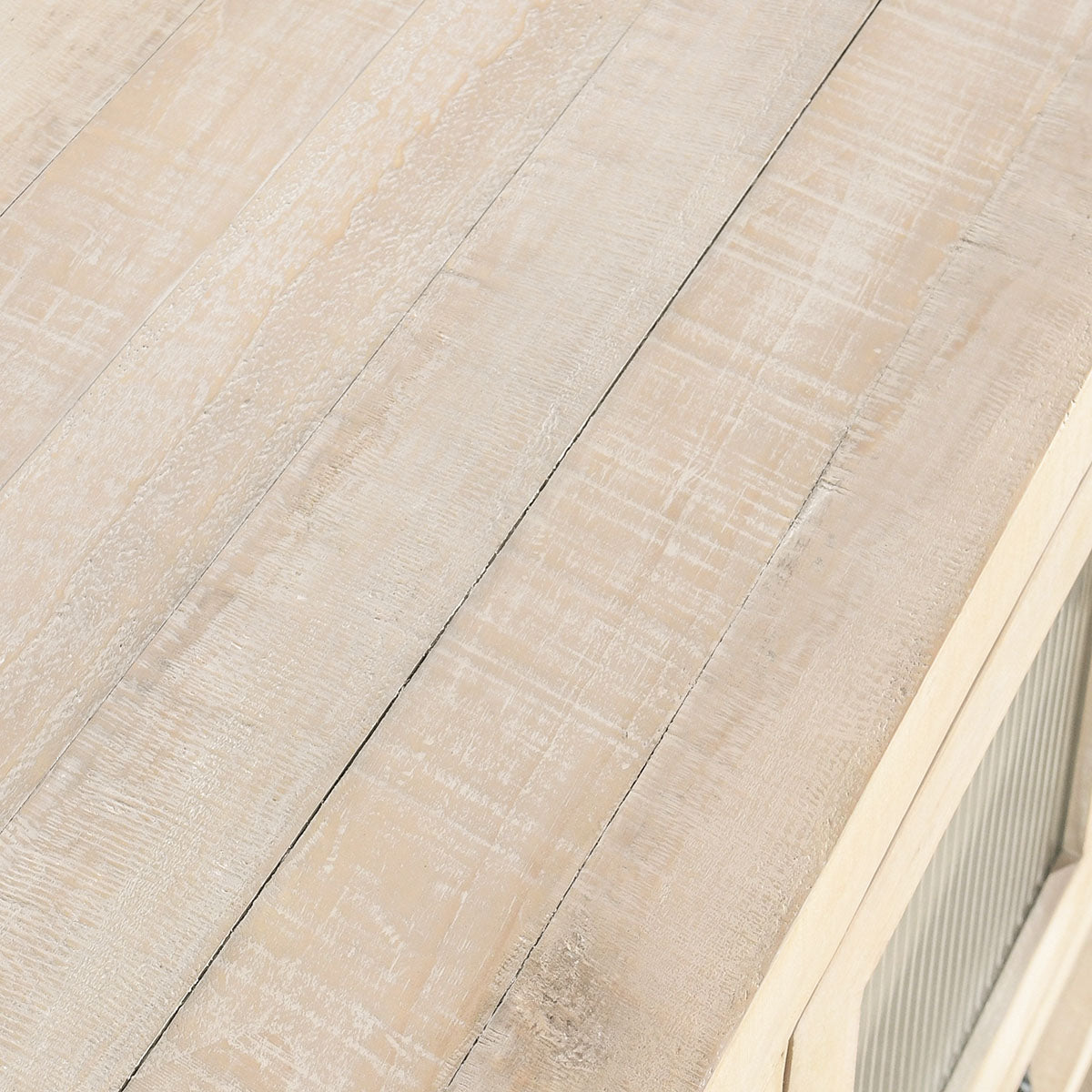 - Color: Whitewashed finish with distressed black finish details.