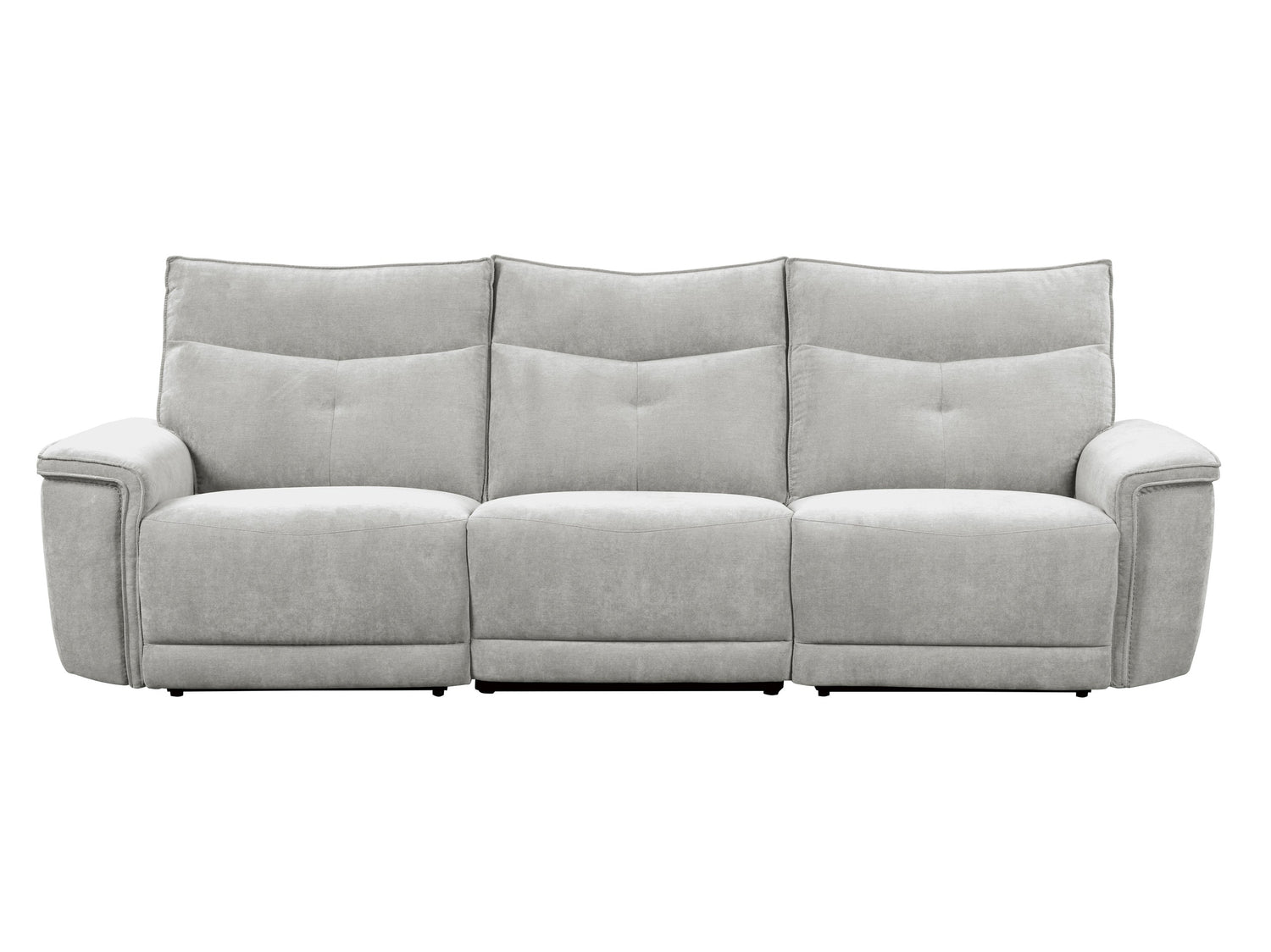 Providing ample seating in modern form the Tesoro Collection. The classic sofa is book-ended by USB port enhanced end power recliners – allowing for maximum versatility when planning the layout of your living room. Mist gray fabric provides a neutral palette for your decorative preferences. The power reclining mechanism of the reclining ends and armless chair brings you to your desired position with a touch of the button.