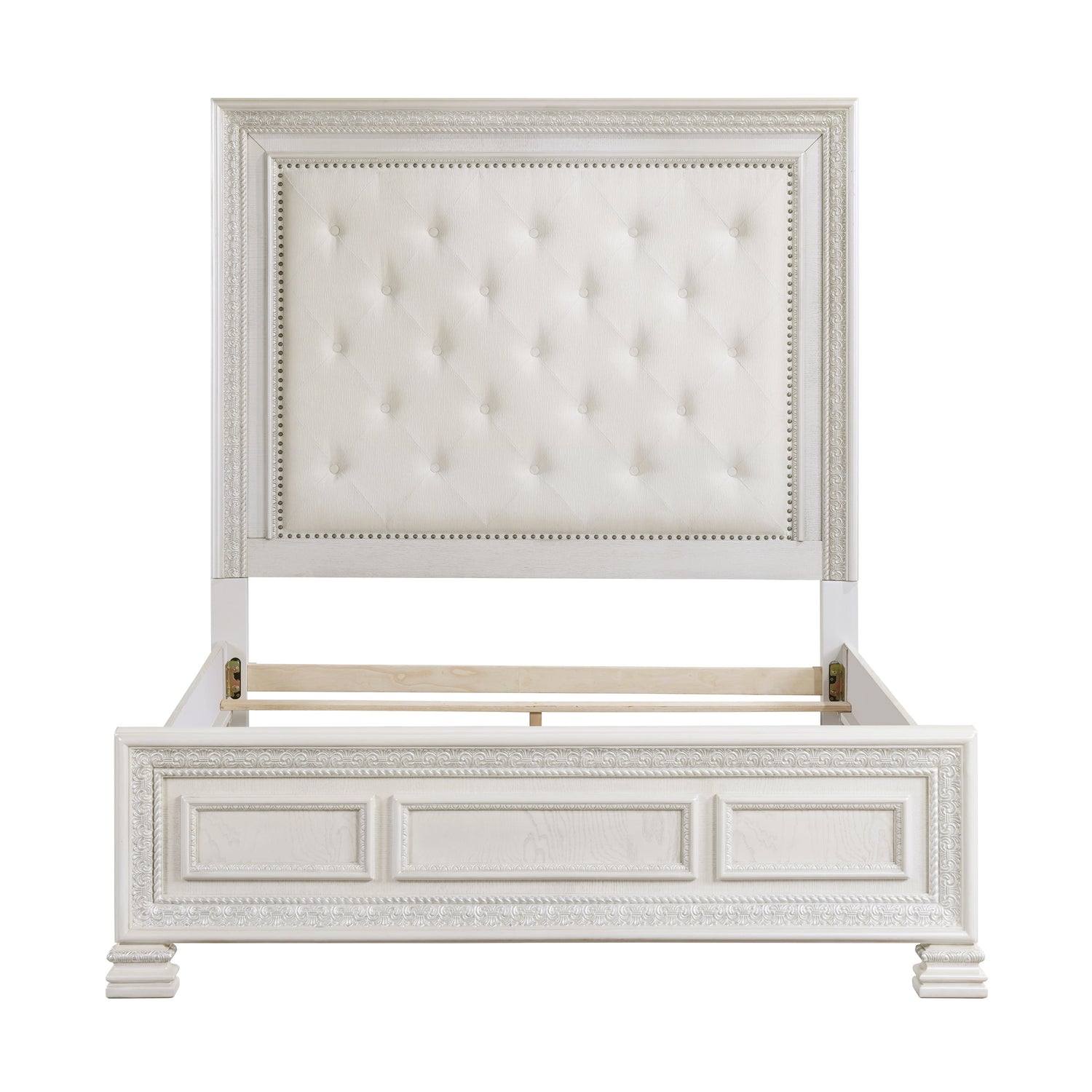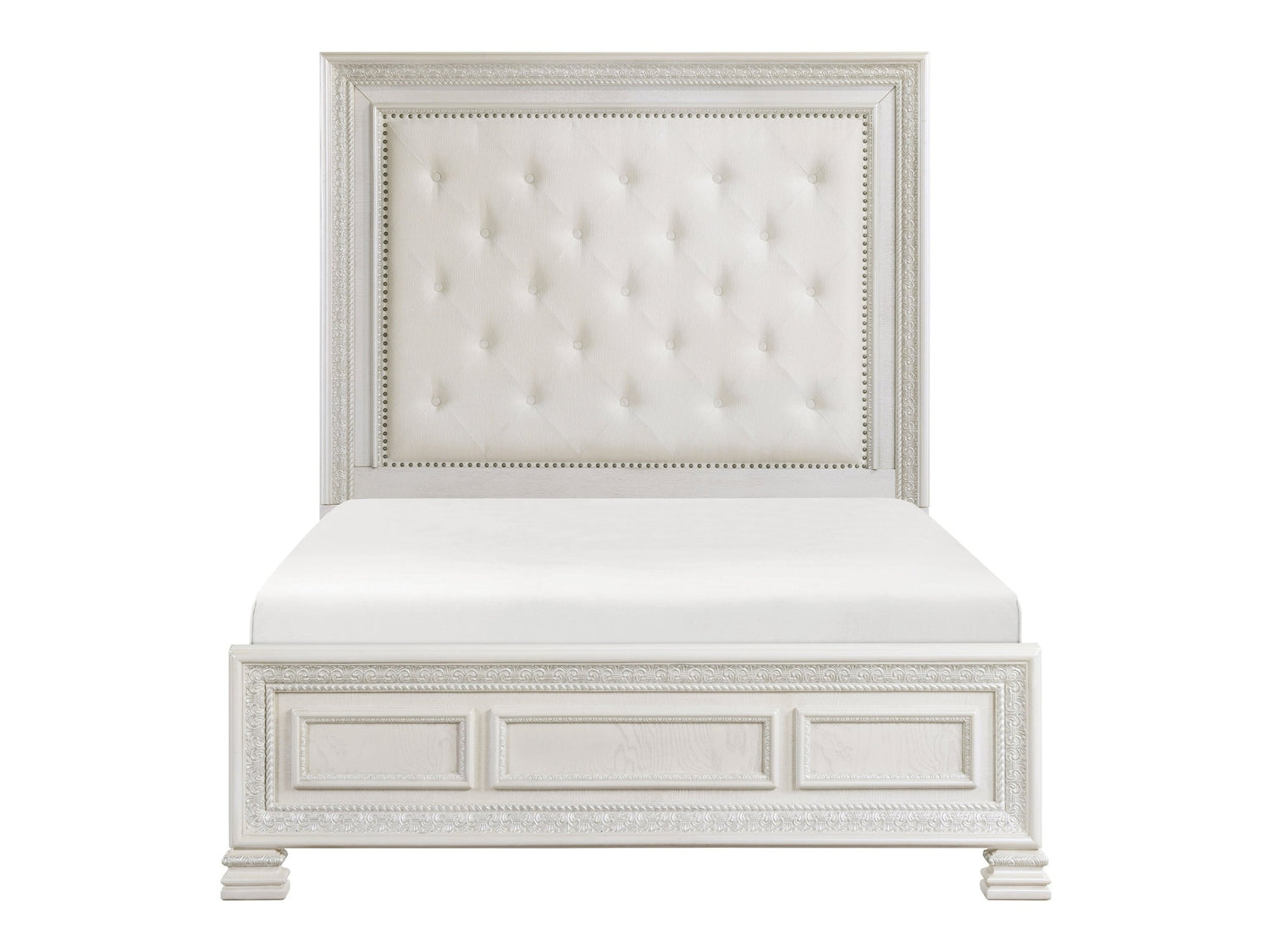 Modern Classicism is defined in the elegant presentation of the Theodora Collection. The treasured themes of old-world accenting – egg and dart molding, acanthus detailing, rope molding – front the California King bed, the timeless style enhanced by the modern pearl white finish over the collection’s ash veneer. The mansion headboard features pearl white textured fabric upholstery with button-tufting and nailhead trim.