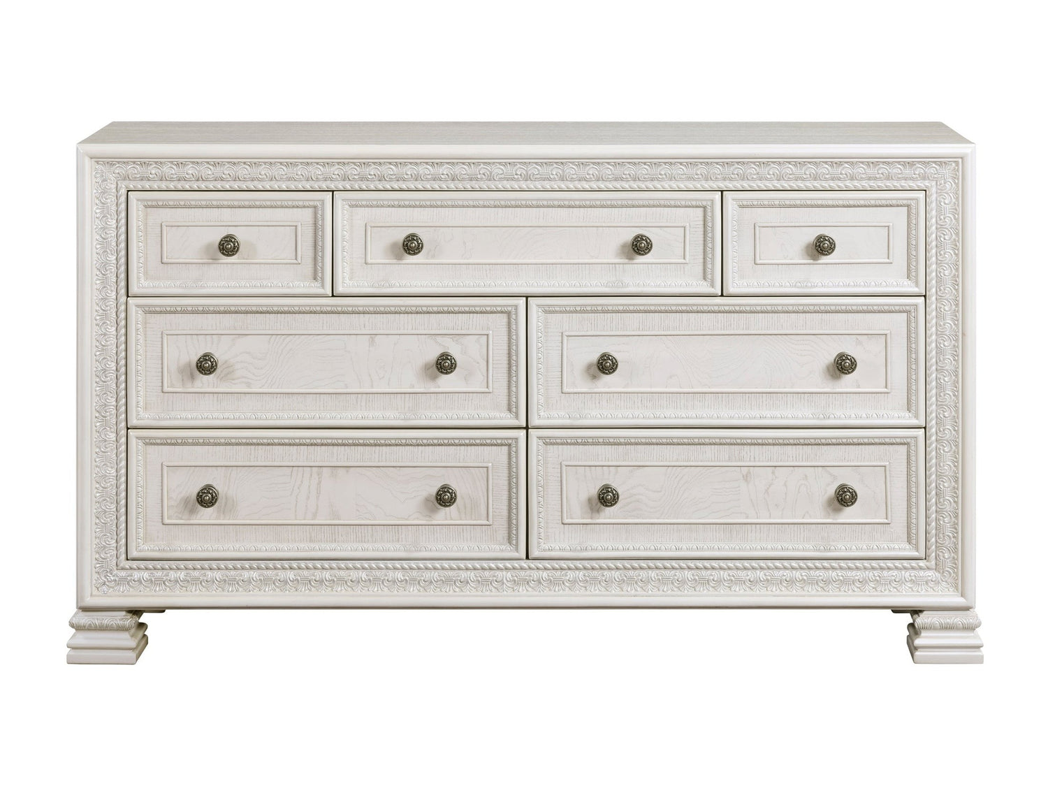 Modern Classicism is defined in the elegant presentation of the Theodora Collection. The treasured themes of old-world accenting – egg and dart molding, acanthus detailing, rope molding, detailed knob hardware – front the dresser, the timeless style enhanced by the modern pearl white finish over the collection’s ash veneer.