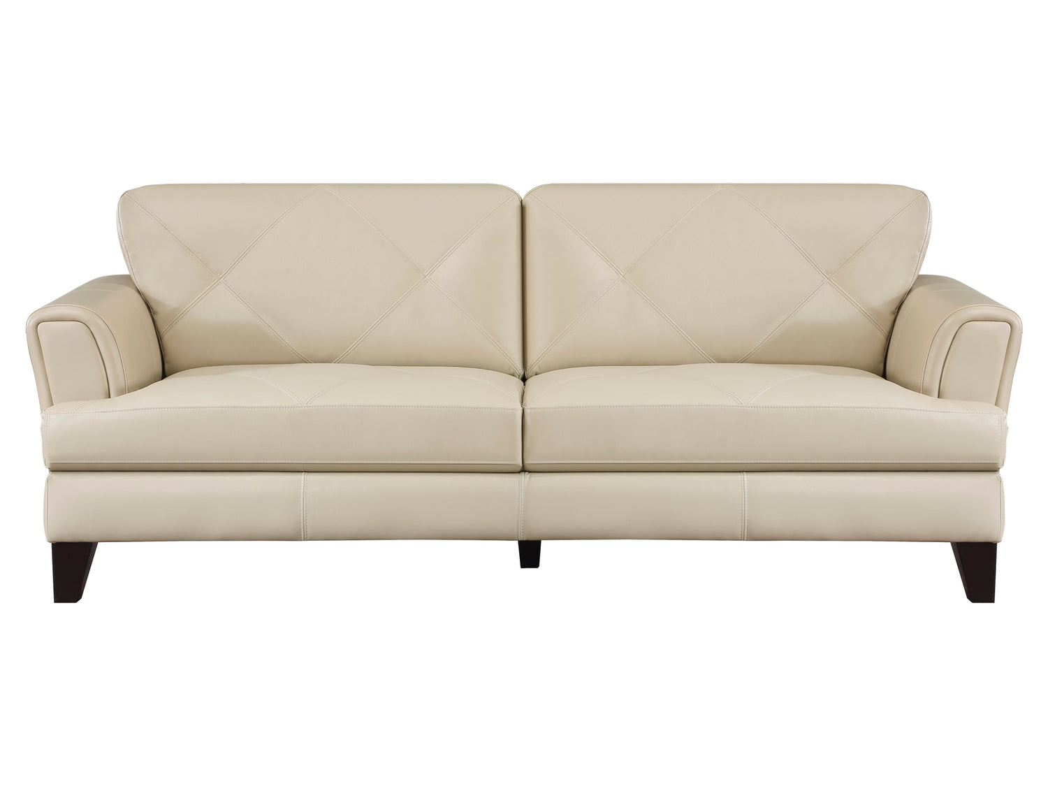 With subtle inspiration from modern European design, the contemporary style of the Thierry Collection pairs understated elegance with defining lines resulting in a sophisticated look for your living room. The cream hue of the sofa’s top grain leather covering – with split-grain leather match – is a neutral decorative selection for your space. Geometric stitching accents the seats of the sofa, while the flare of the track arm completes the modern profile.