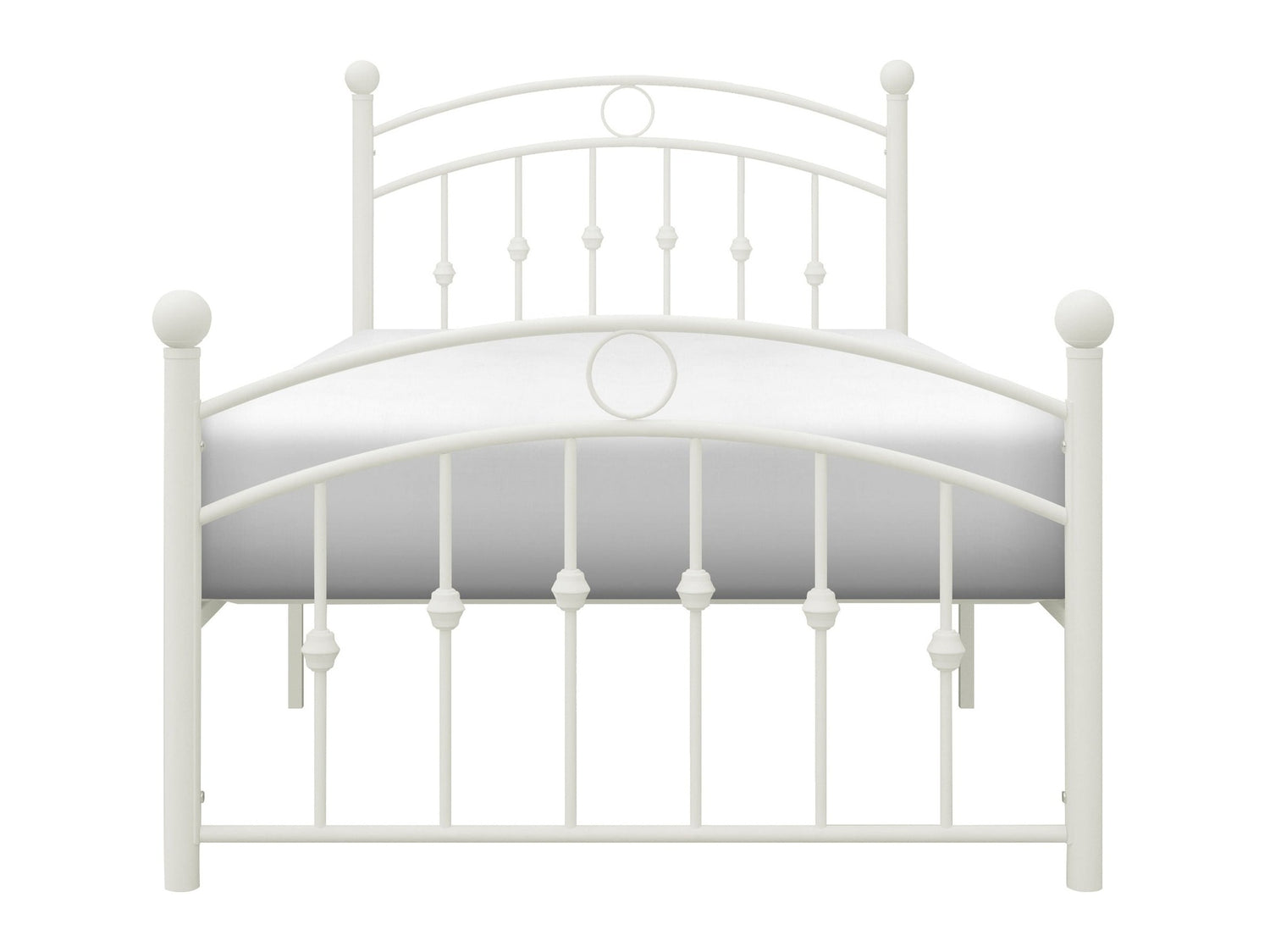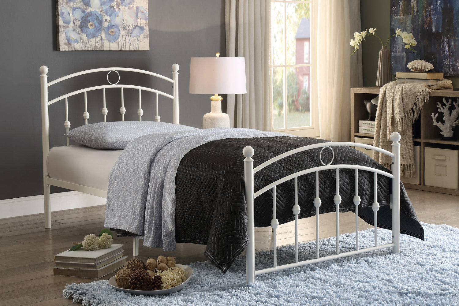 The arched panels of the twin size headboard and footboard create eye-catching drama in the Tiana Collection. The white finish along with ball finials and the circle motif - that centers the headboard and footboard – all lend to the traditional look of the collection. Full bed size option is also available.
