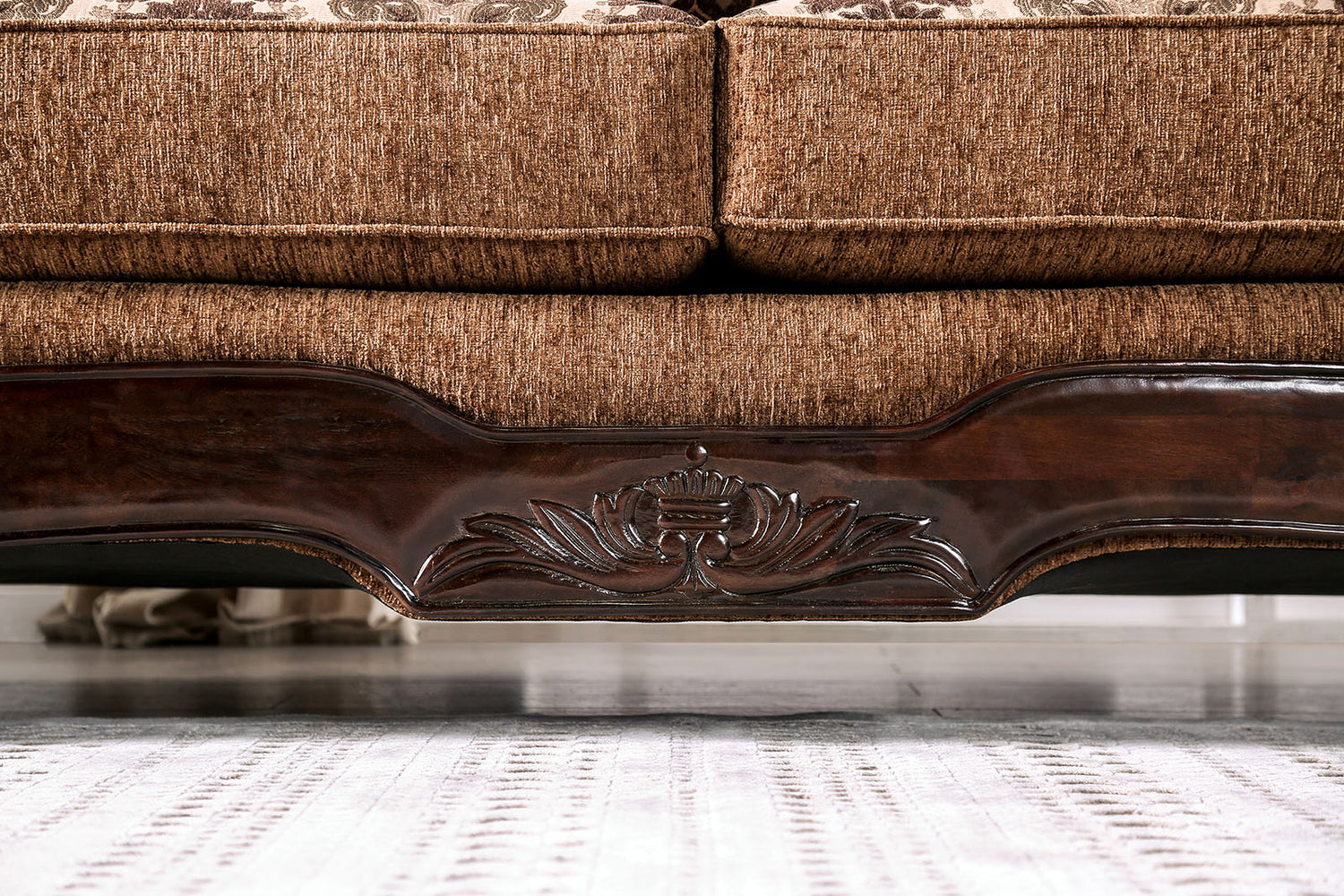 Add sophistication to your living room with this sofa the Tilde Collection. This sofa is unique, with a curvy design and dapper damask fabric on the reversible cushions. Each plush cushion is encased in brown welting, and the rolled arms feature wooden accents, creating an antique elegance unparalleled by other sofas. All the way down to the rounded bun feet, this sofa exudes refined taste.