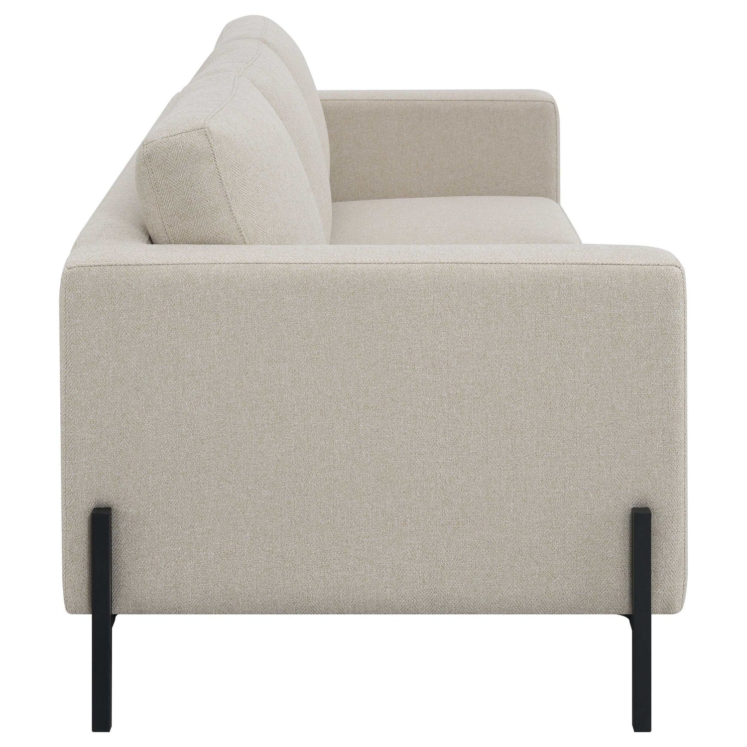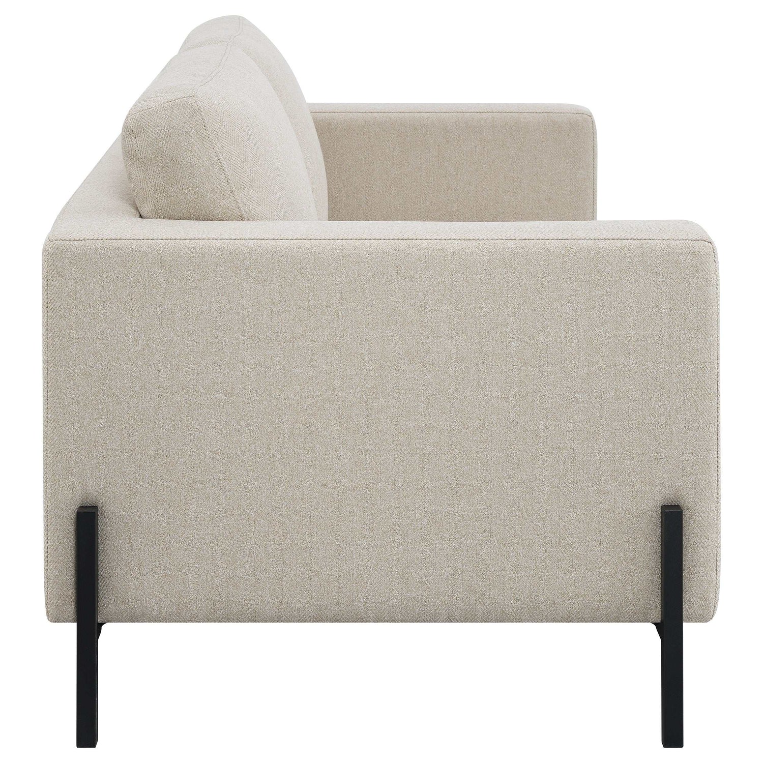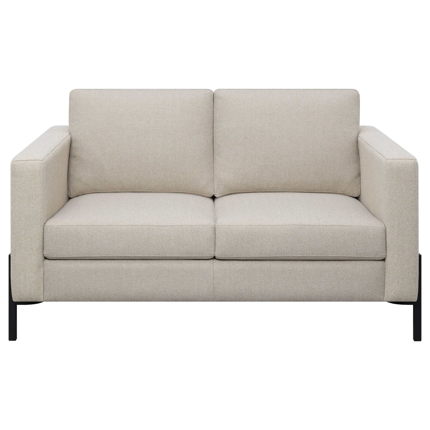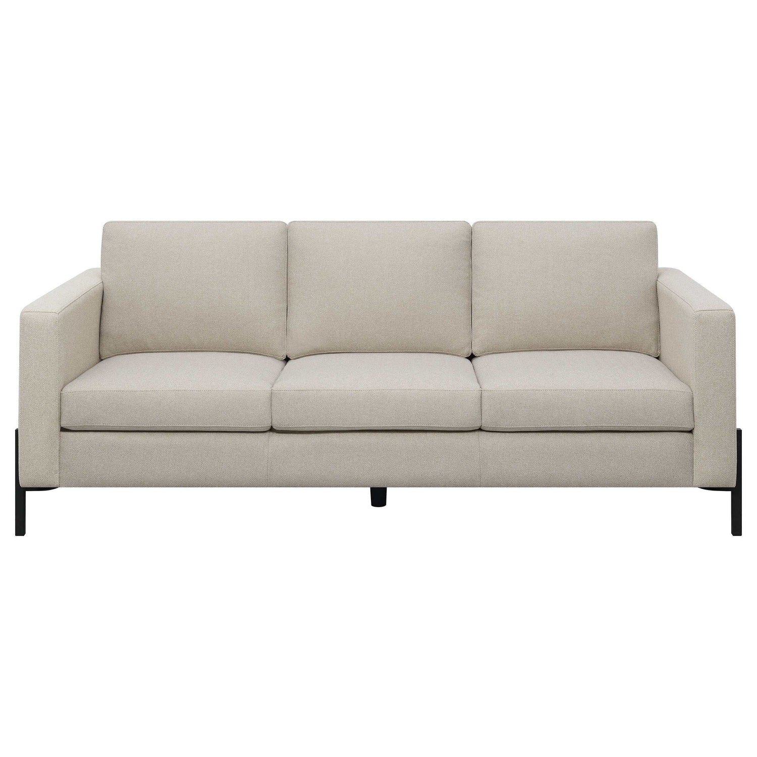 Introducing our meticulously designed modern sofa set, the epitome of luxury and comfort. Boasting clean lines and impeccable tailoring, its understated textured herringbone fabric exudes sophistication. The attached seats, built with pocket coil springs, promise unrivaled comfort, making every moment spent on the sofa memorable. Complemented by the stylish elevated metal leg base in a sleek black finish, this sofa set stands out not just for its beauty but also for its durability. Crafted with precision, it's an ensemble that's as inviting as it is elegant, ensuring your living space radiates contemporary charm. Dive into unmatched comfort and style.