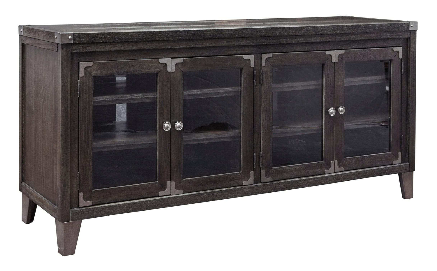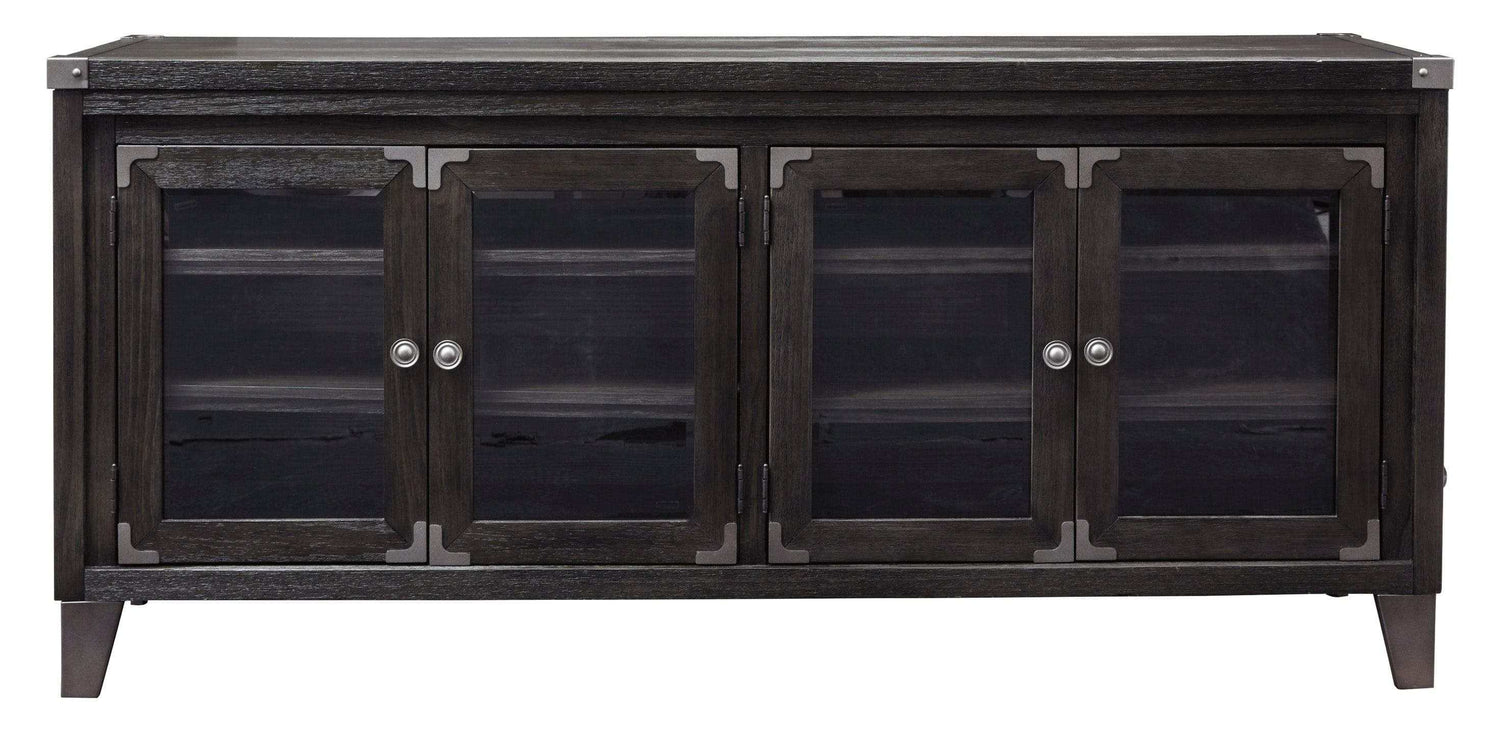 Part ultra-contemporary, part urban industrial, this TV stand is totally your vision. Two double-door cabinets with inset clear glass fronts showcase the beauty of transparency. Treated to an industrial gray finish that brings out the complexity of pine veneer, this designer TV stand truly shines thanks to bracket and nailhead accents and sleek tapered feet in zinc-tone metal for mixed media flair.