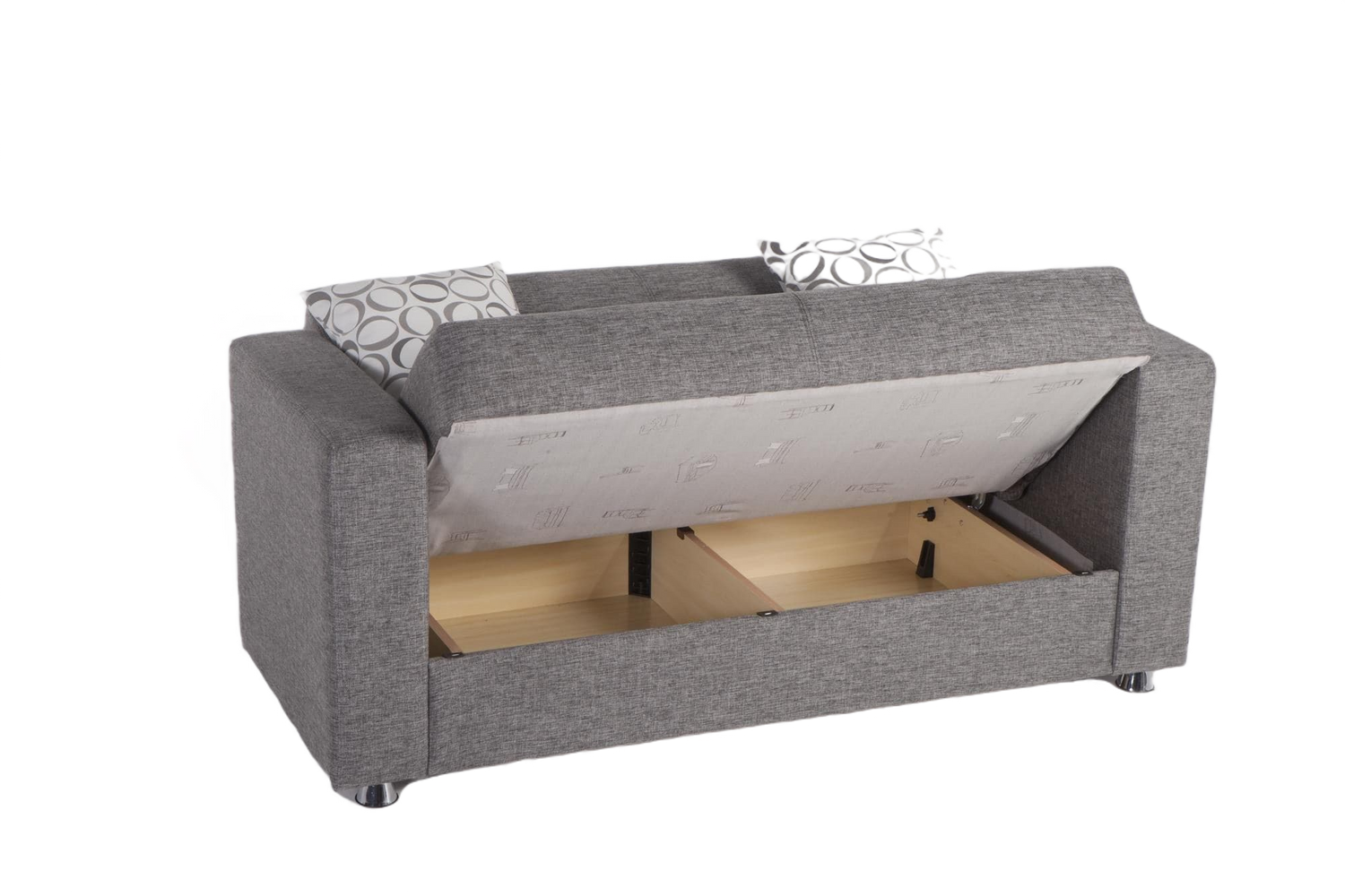 Elevate your living space with the Tokyo Loveseat in Diego Gray or Santa Glory Gray. Its modern design features clean lines, a sleek silhouette, and round chrome legs, making it a perfect addition to contemporary interiors. This loveseat not only offers comfortable seating but also includes built-in storage and easily transforms into a cozy sleeper. Enjoy the softness of supportive cushions and the versatility of performance upholstery that seamlessly complements any decor.