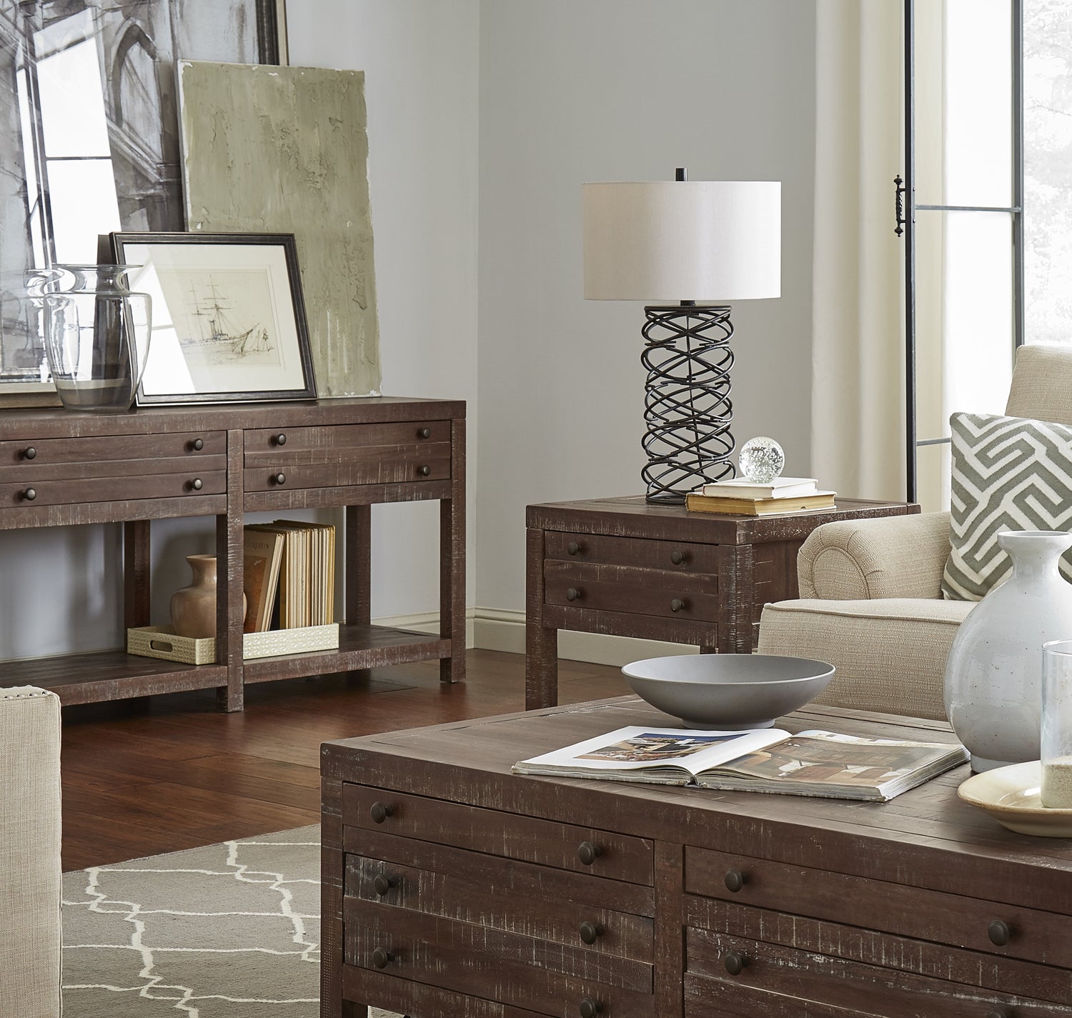 - End table is constructed with solid wood frame, front, top and side, plywood drawer boxes, engineered wood dust cover and back panel