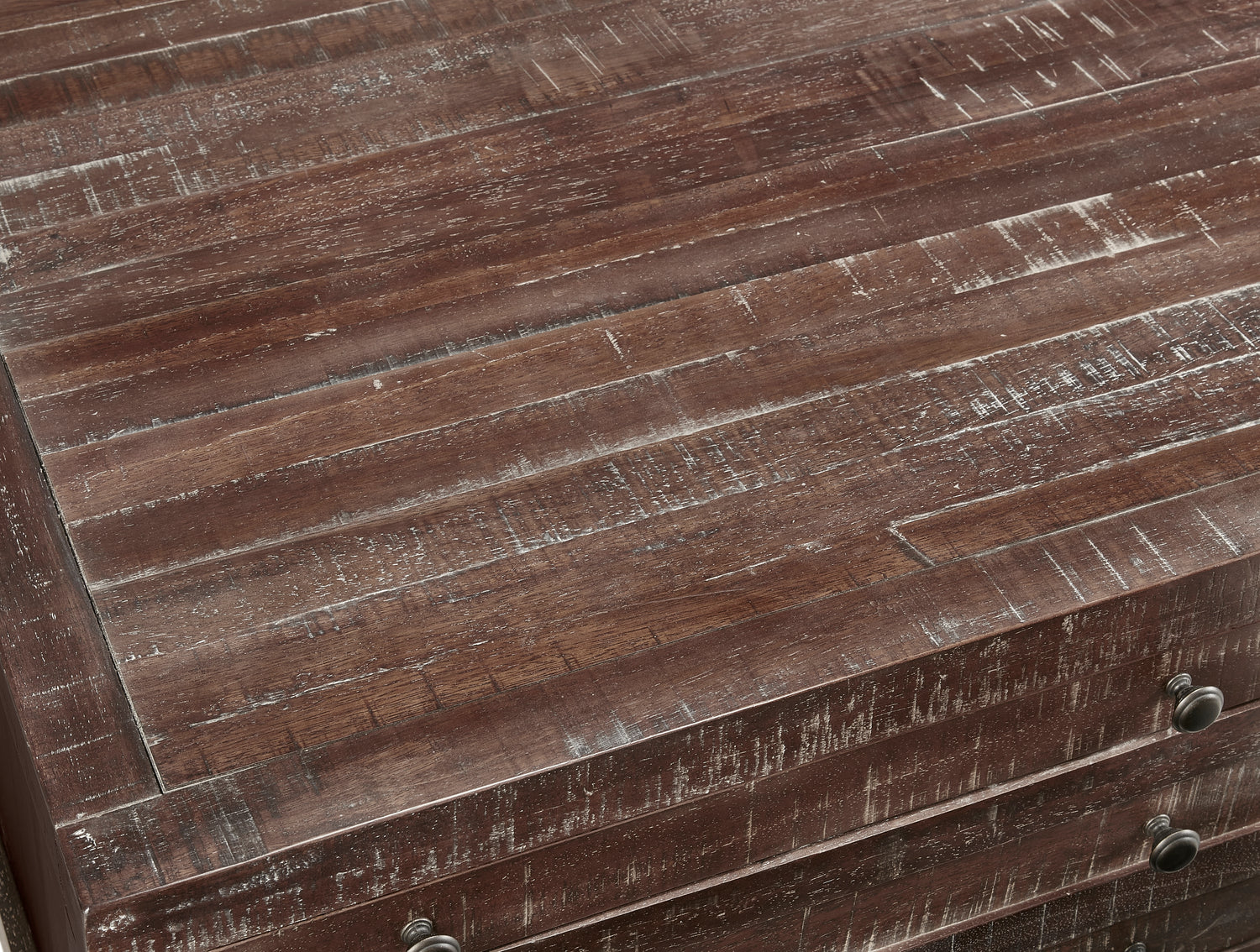 - Proprietary finishing process uses dark glaze to accentuate the wood grain and a light wash to simulate the patina of age; oil rubbed bronze knobs