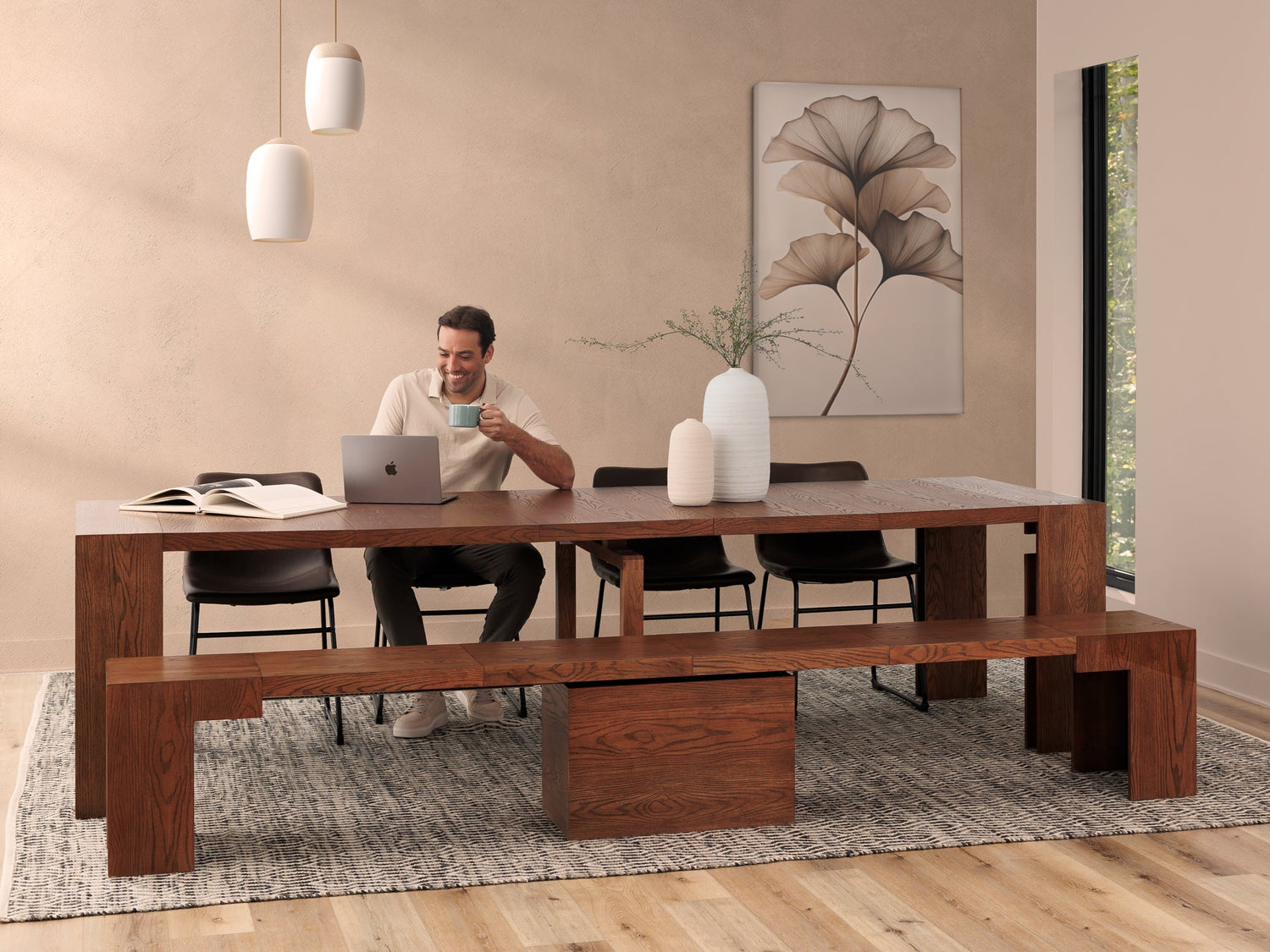 Transformer Dining Set – The Practical is designed for smart, efficient dining, combining sleek style with everyday functionality. Its clean, minimalist design maximizes usability in any space, making it perfect for both daily family meals and entertaining guests. With a smooth extendable configuration, it adapts effortlessly to your needs, offering a contemporary centerpiece that balances practicality with refined elegance.