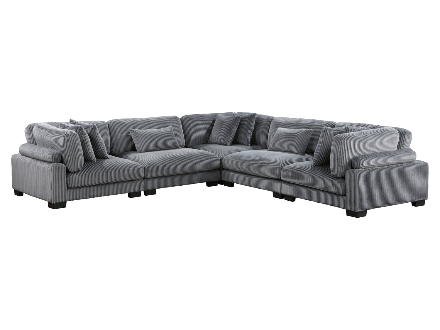 Configurable to your available space, the Traverse Collection allows for the addition and detachment of pieces for a customized seating experience. The 5-piece sectional configuration consists of three corner units paired with two armless chairs. The gray corduroy fabric upholstery creates a plush expanse for a soft touch experience. The corner seats each feature two toss pillows, adjustable back and arm rest, and reversible cushions. The armless chairs feature a lumbar pillow, and reversible cushions.