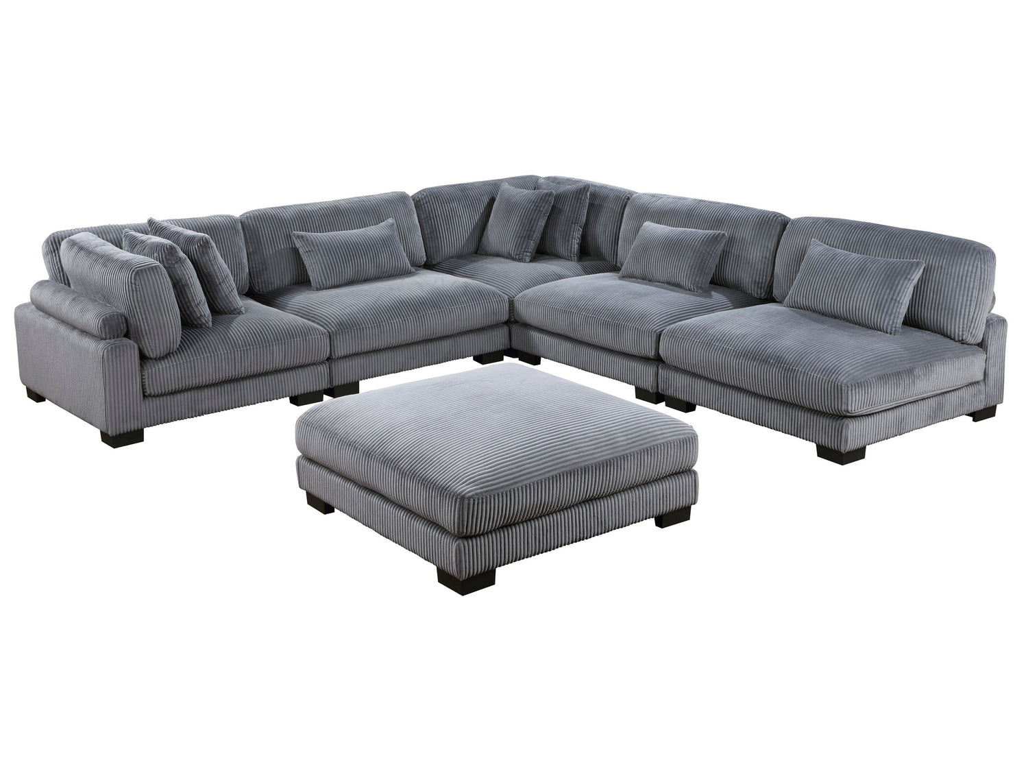 Configurable to your available space, the Traverse Collection allows for the addition and detachment of pieces for a customized seating experience. The 6-piece sectional configuration consists of two corner units paired with three armless chairs, and an ottoman. The gray corduroy fabric upholstery creates a plush expanse for a soft touch experience. The corner seat features two toss pillows, adjustable back and arm rest, and reversible cushions. The armless chair features a lumbar pillow, and reversible cushions.