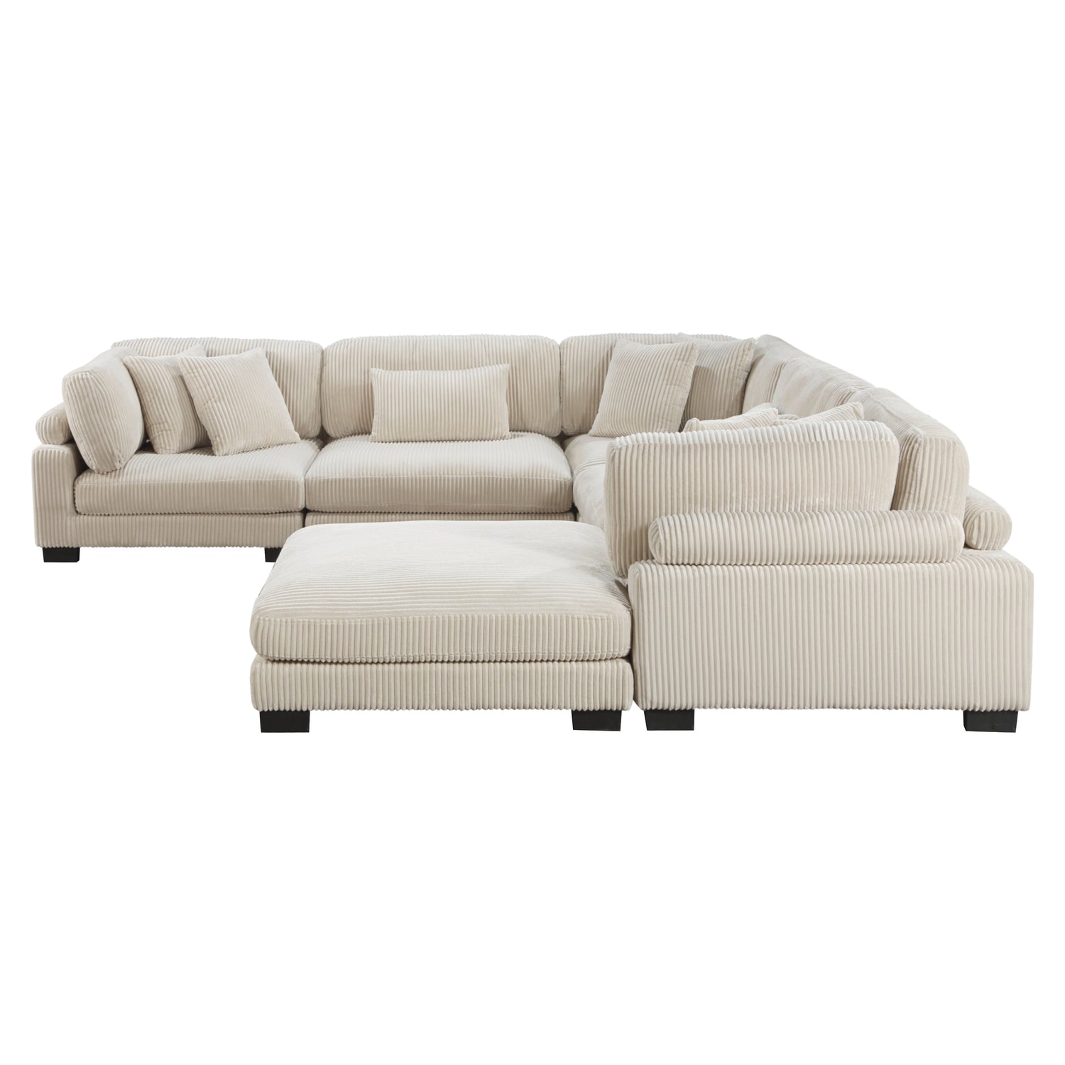 Configurable to your available space, the Traverse Collection allows for the addition and detachment of pieces for a customized seating experience. The 6-piece sectional configuration consists of three corner units paired with two armless chairs, and an ottoman. The beige corduroy fabric upholstery creates a plush expanse for a soft touch experience. The corner seats each feature two toss pillows, adjustable back and arm rest, and reversible cushions. The armless chairs feature a lumbar pillow, and reversible cushions.