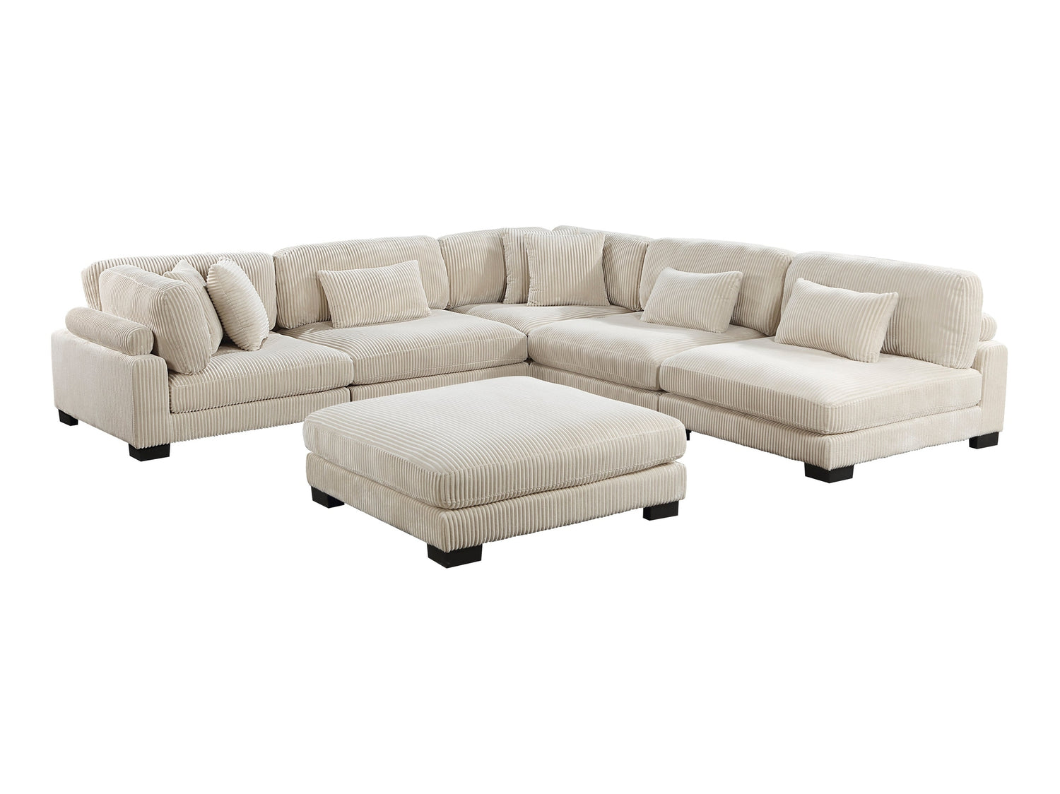 Configurable to your available space, the Traverse Collection allows for the addition and detachment of pieces for a customized seating experience. The 6-piece sectional configuration consists of two corner units paired with three armless chairs, and an ottoman. The plush beige corduroy fabric upholstery creates a plush expanse for a soft touch experience. The corner seat features two toss pillows, adjustable back and arm rest, and reversible cushions. The armless chair features a lumbar pillow, and reversible cushions.