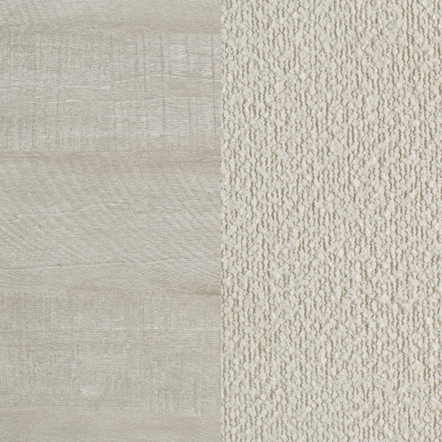 - Headboard upholstered in cream bouclé fabric for added softness and style