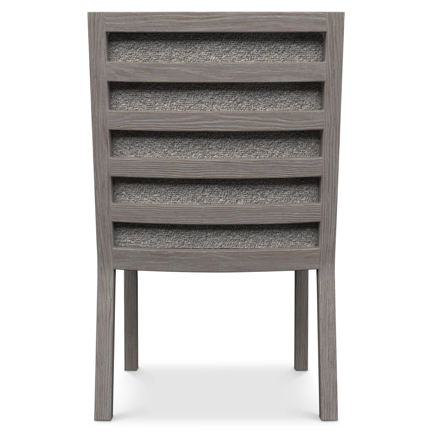 - Exposed wood frame ladderback side chair crafted from flat-cut yellow pine solids & veneers in L'Ombre finish with upholstered back and seat
