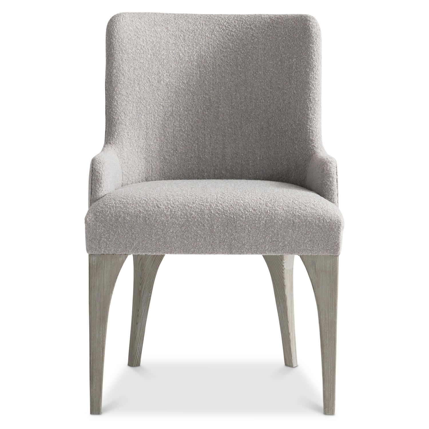 - Upholstered arm chair with base and legs of flat-cut yellow pine solids & veneers in Gris finish