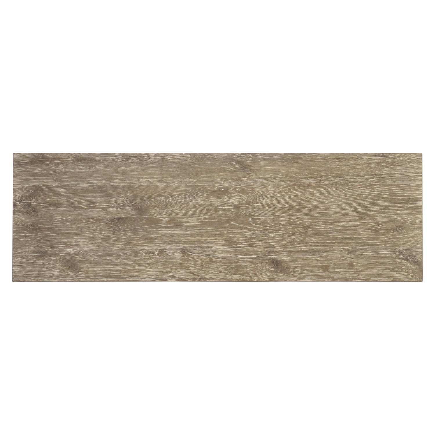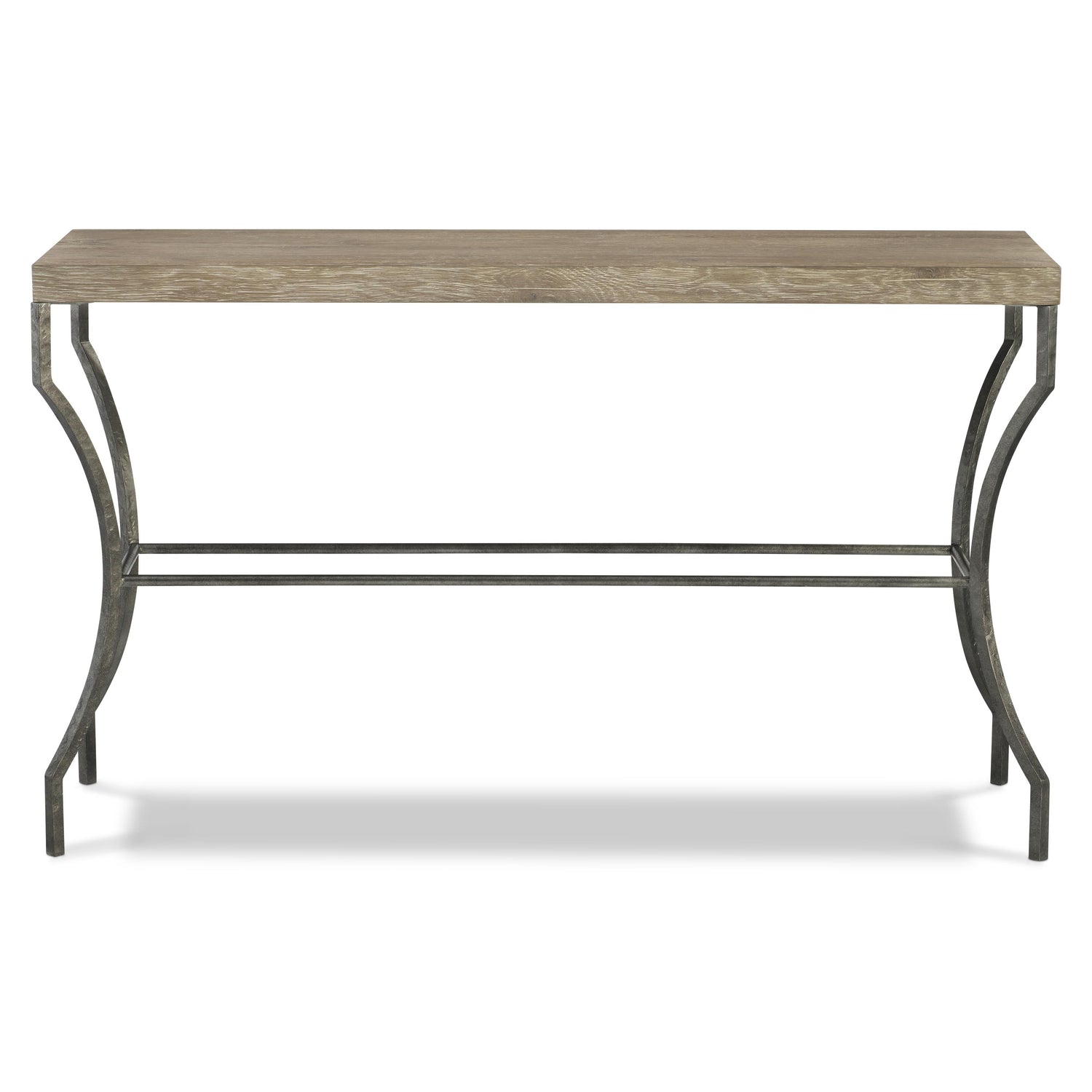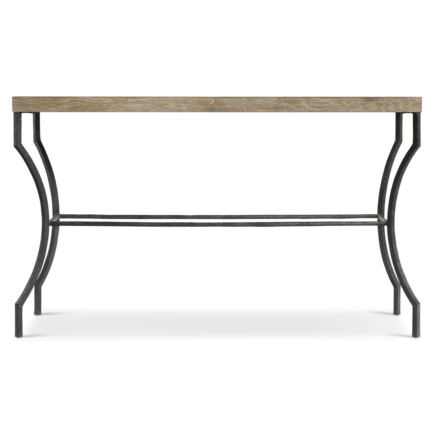 - Oak table top in Aurum finish supported by textured steel base with stretchers in Barlow finish