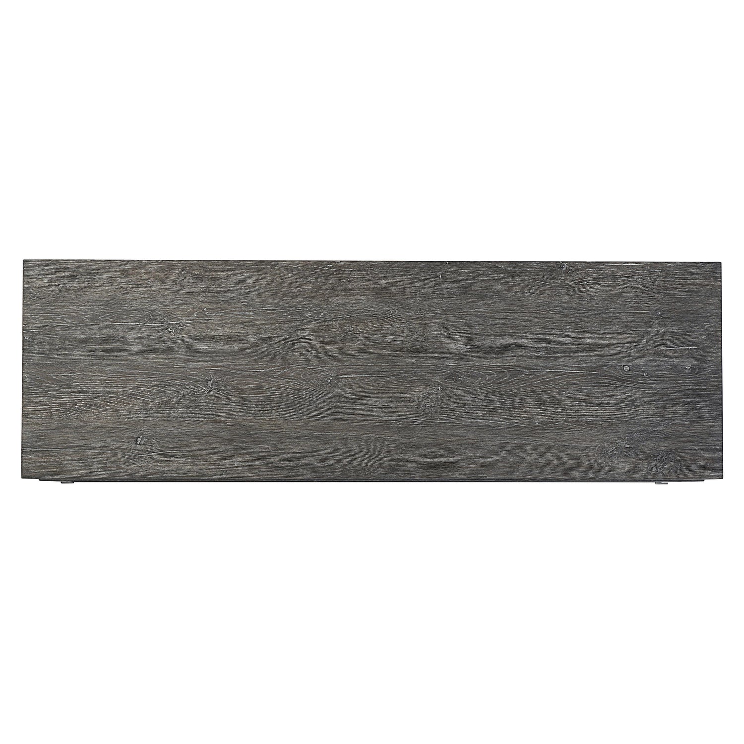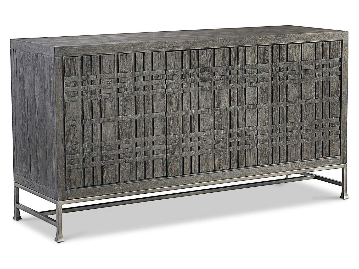 - White oak solids and veneers in Tadon finish on case with textured steel base in Barlow finish