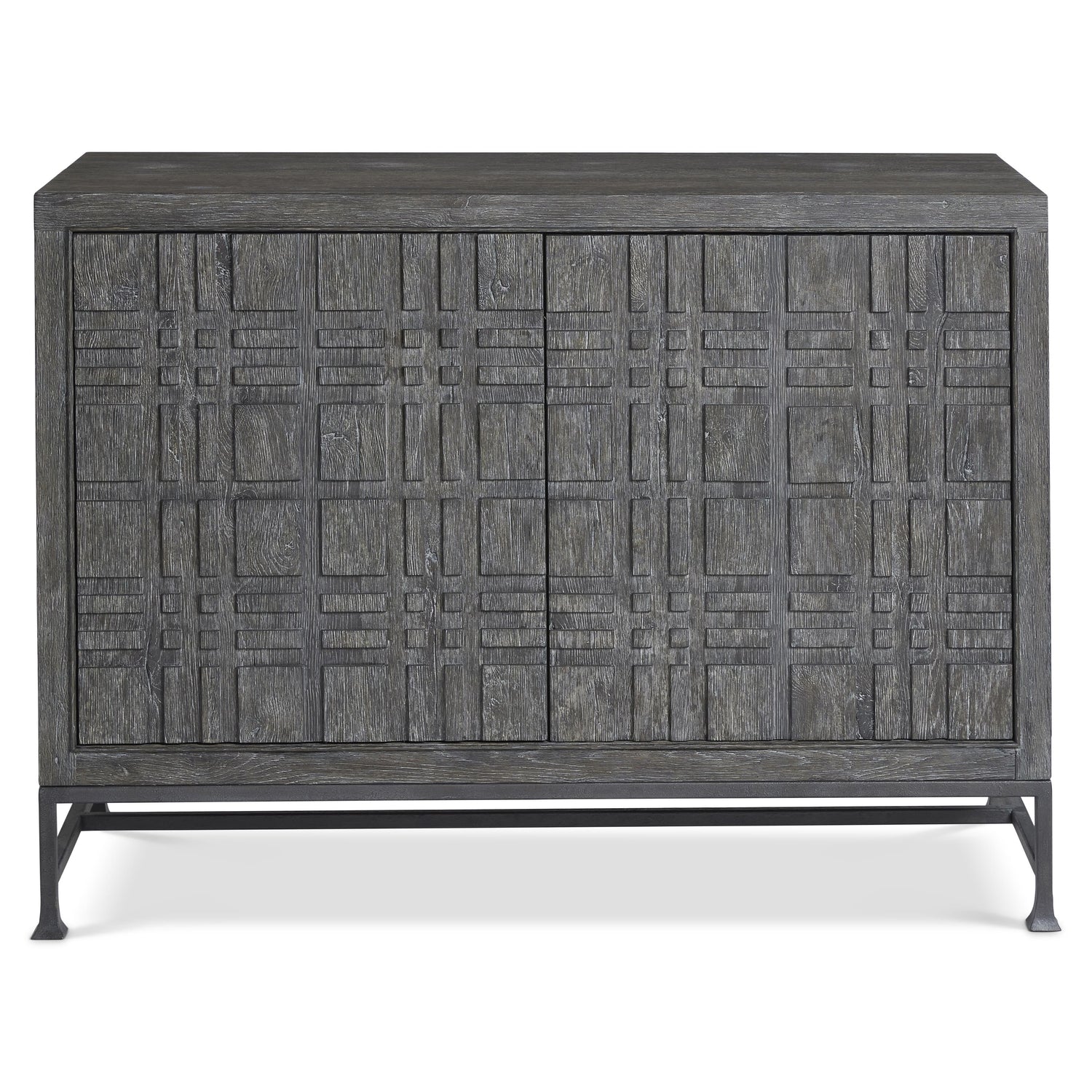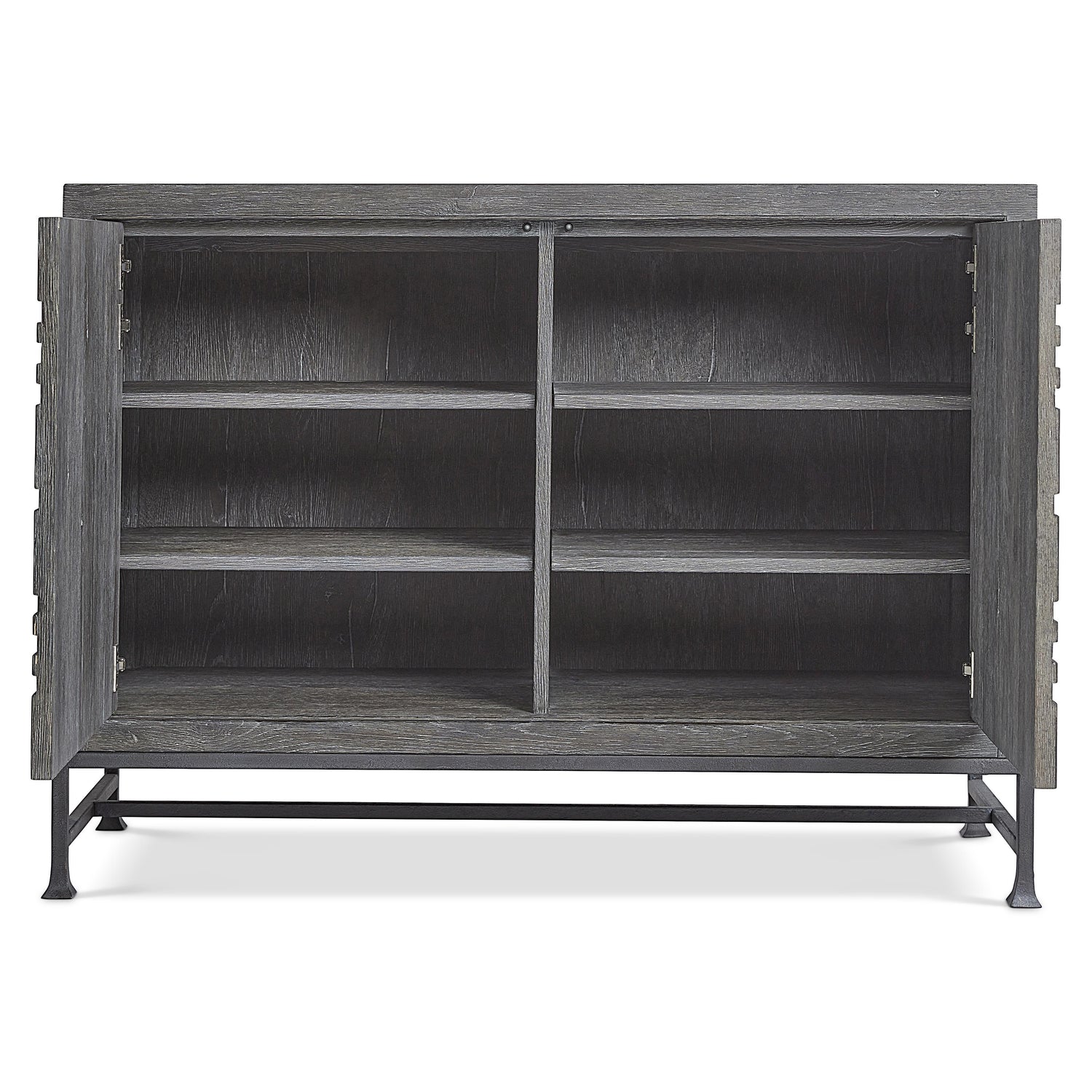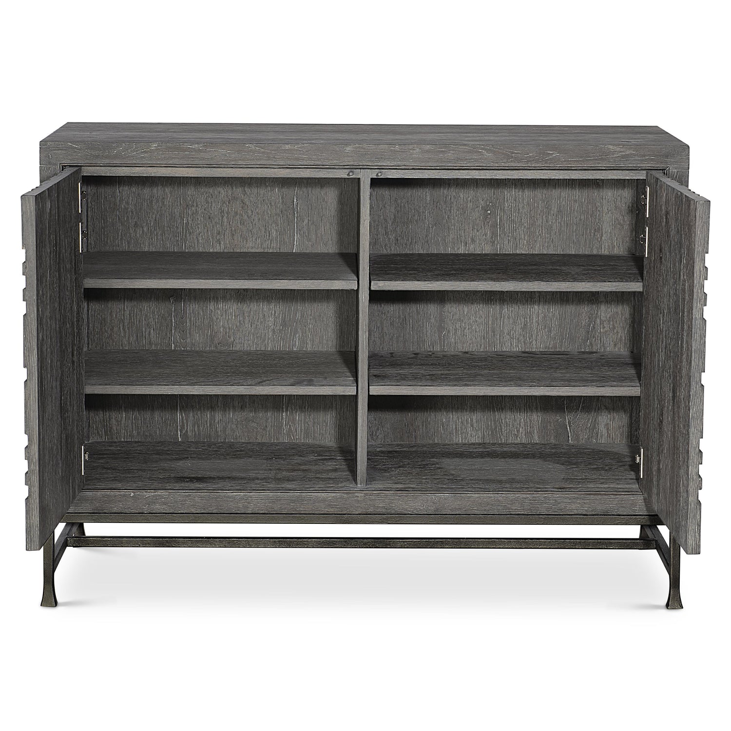 - White oak solids and veneers in Tadon finish on case with textured steel base in Barlow finish