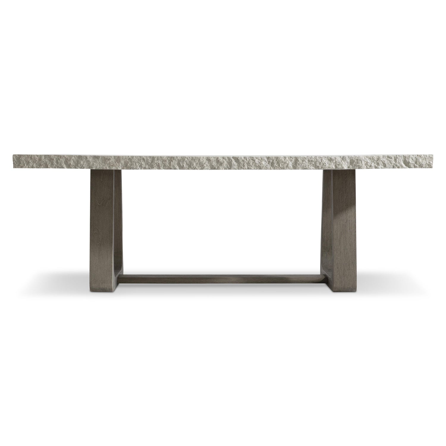 A modern organic design showcases the look of rough-hewn stone over a teak base on the Trouville dining table. The smooth top offers a chiseled edge and is finished in Sand Grey. The balance of natural materials is formed with two curving pedestals in loops of gorgeous teak connected by a stretcher base. The natural style, at home in an outdoor setting, is equally beautiful indoors.