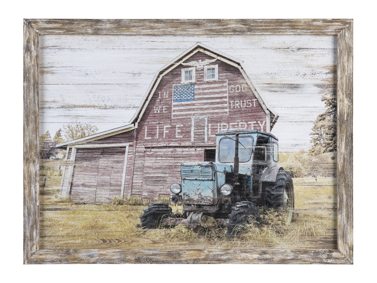 - Americana-inspired wall art featuring a rustic barn and vintage tractor