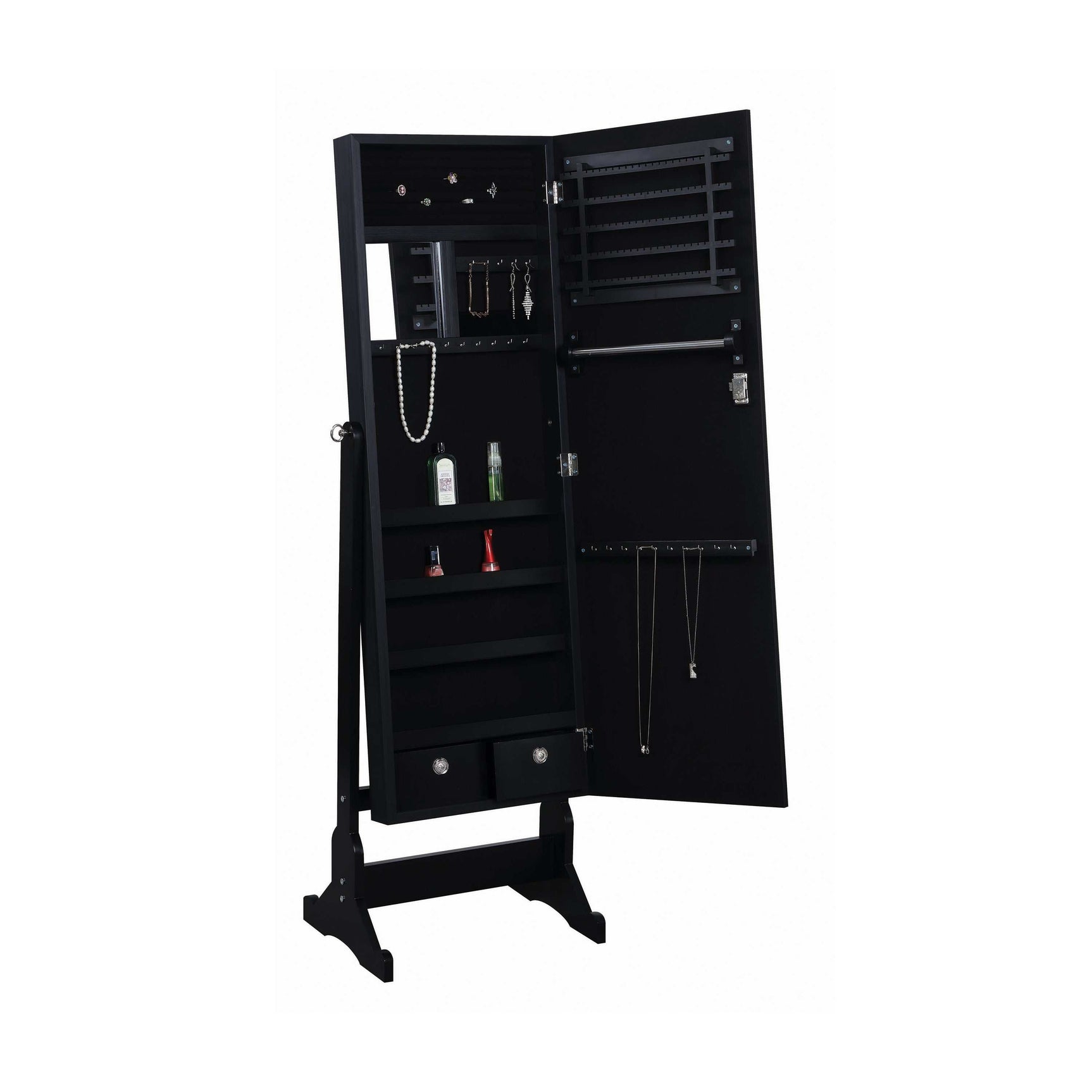 Chic in black, this cheval jewelry mirror is an inspired addition. It combines wonderful style with useful function to create the perfect combination. The mirror opens to reveal ample space for tucking away all your favorite jewelry pieces. Resting within a floor stand, the mirror tilts to create the best viewing angle. Perk up a bedroom or walk-in closet dressing area while staying organized at the same time.
