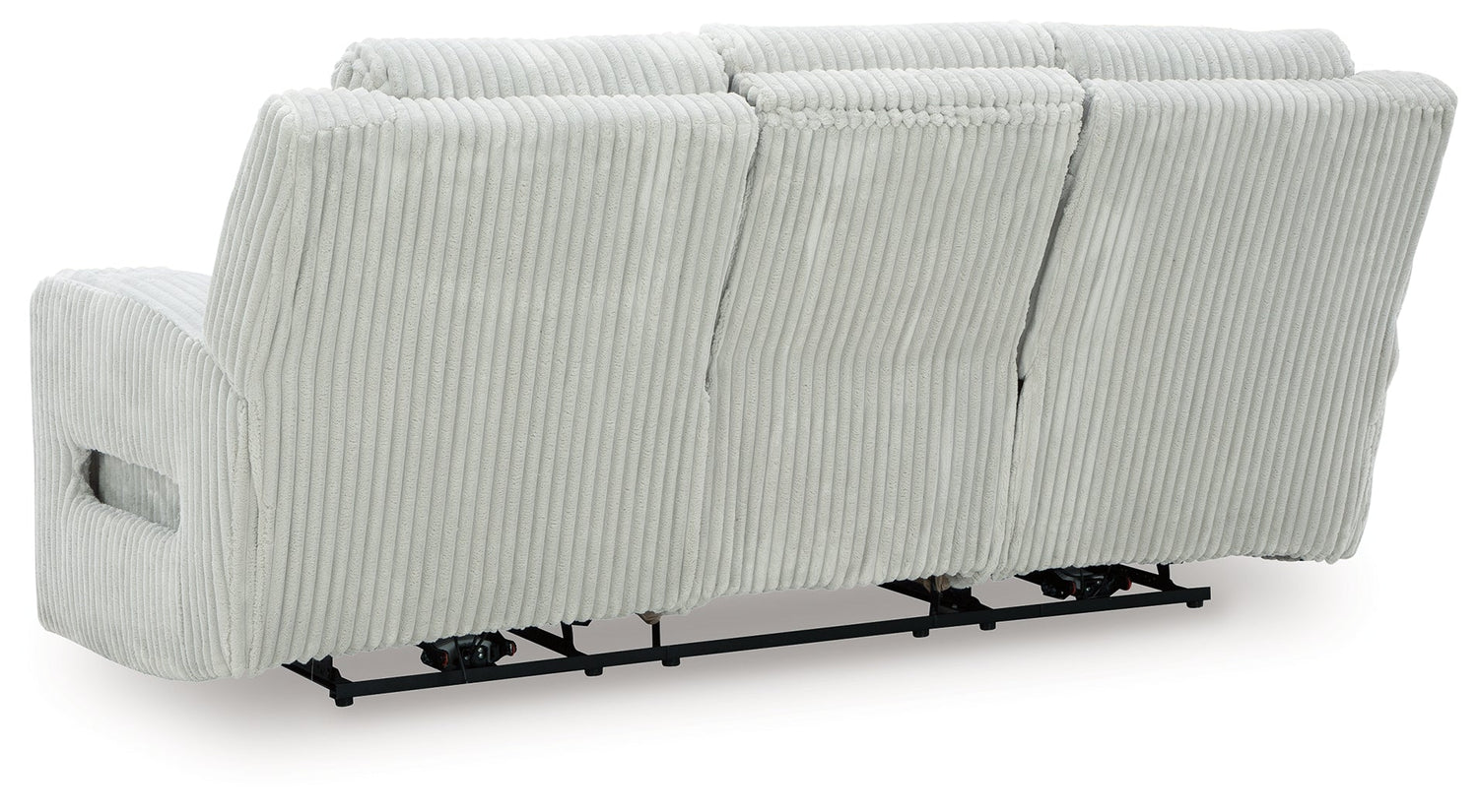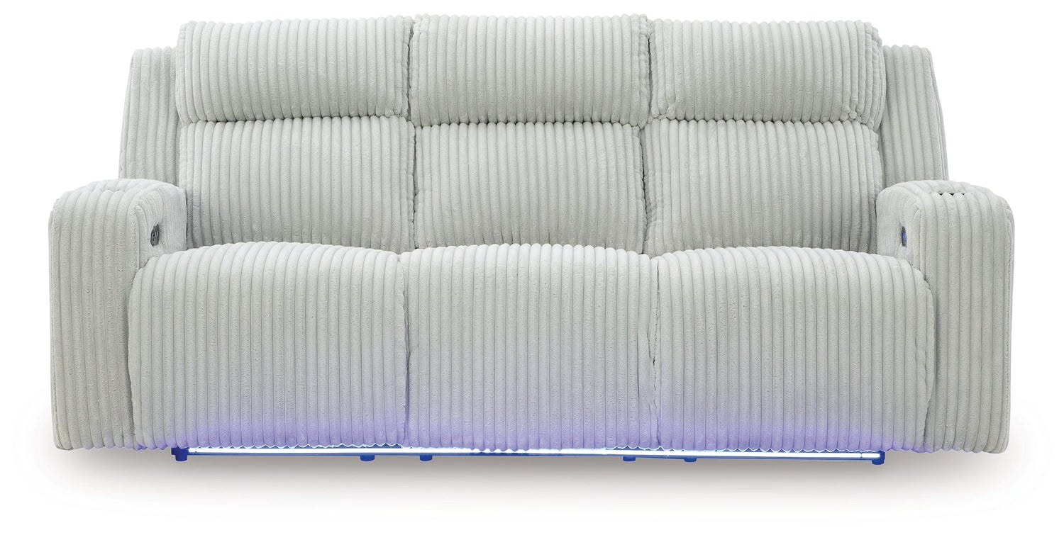 Trend-right style, meet irresistible modern function. Your living room gets a cozy-cool upgrade with this power reclining sofa. Curl up in its ultra-chic corded upholstery and recline with one-touch controls. Is it movie night or game time? With ambient LED lighting and wireless audio connectivity, this sofa transforms from a serene relaxation spot to an entertainment hub. Its drop-down table, wireless charging and cup holders make lounging all the more convenient.