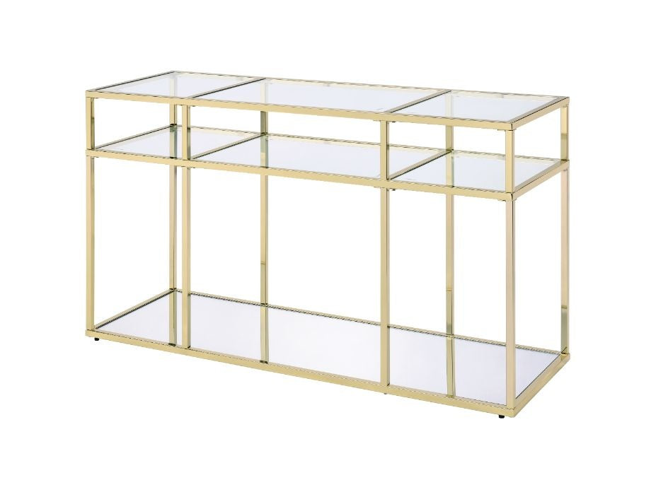 Modern simplicity makes your space feel uncluttered and stylish. The Uchenna Sofa Table has a brilliant color and lustrous finish to enhance it's sleek modern silhouette. Metal table frame in a gold finish exudes lustrous shine, topped with tempered glass to bring a glamorous-yet-modern flair to this piece. The Uchenna Sofa Table really makes a style statement. Shape up your space with this voguish accessory.