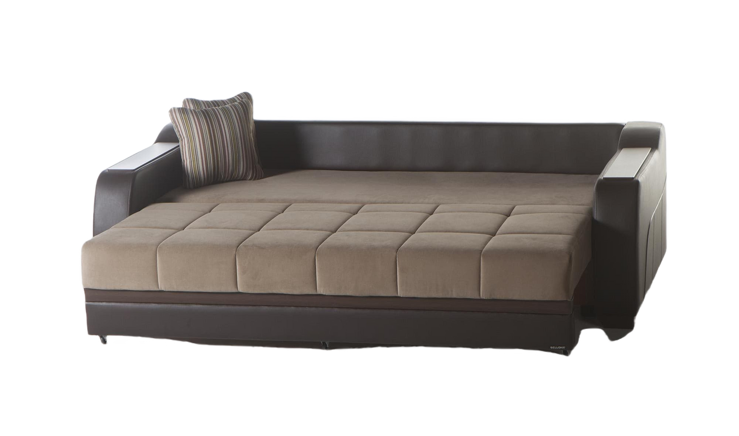 The Ultra Sectional is designed for the modern home. Its modular chaise lounge and matching armchair offer versatile seating options. The leatherette exterior, performance fabric interior, and wood detailing exude luxury. With built-in storage and a sleeper function, it's the perfect blend of style and functionality.