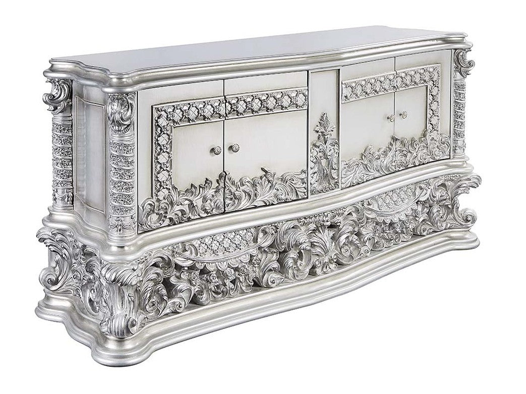 See the extravagant style and classical design all over the Valkyrie Dining Room Collection. Bold, intricate scrollwork accent is highlighted throughout each piece in this collection. Antique Platinum Finish paired with muted gray tone brings attention to its gorgeous details. Rectangular dining table showcases a timeless pedestal-style silhouette while matching chairs feature button-tufted upholstery for lavish comfort. Bring a dramatic change to your home with the Valkyrie Dining Room Collection.