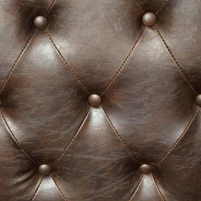 For those in need of an accent piece that is both comfortable and luxurious, this chair and ottoman combination is the perfect choice. The chair features button tufting and nailhead trim, while the ottoman is smooth with nailheads as well. On top of that, both are upholstered in rustic brown leatherette for that attractive, worn-out look.
