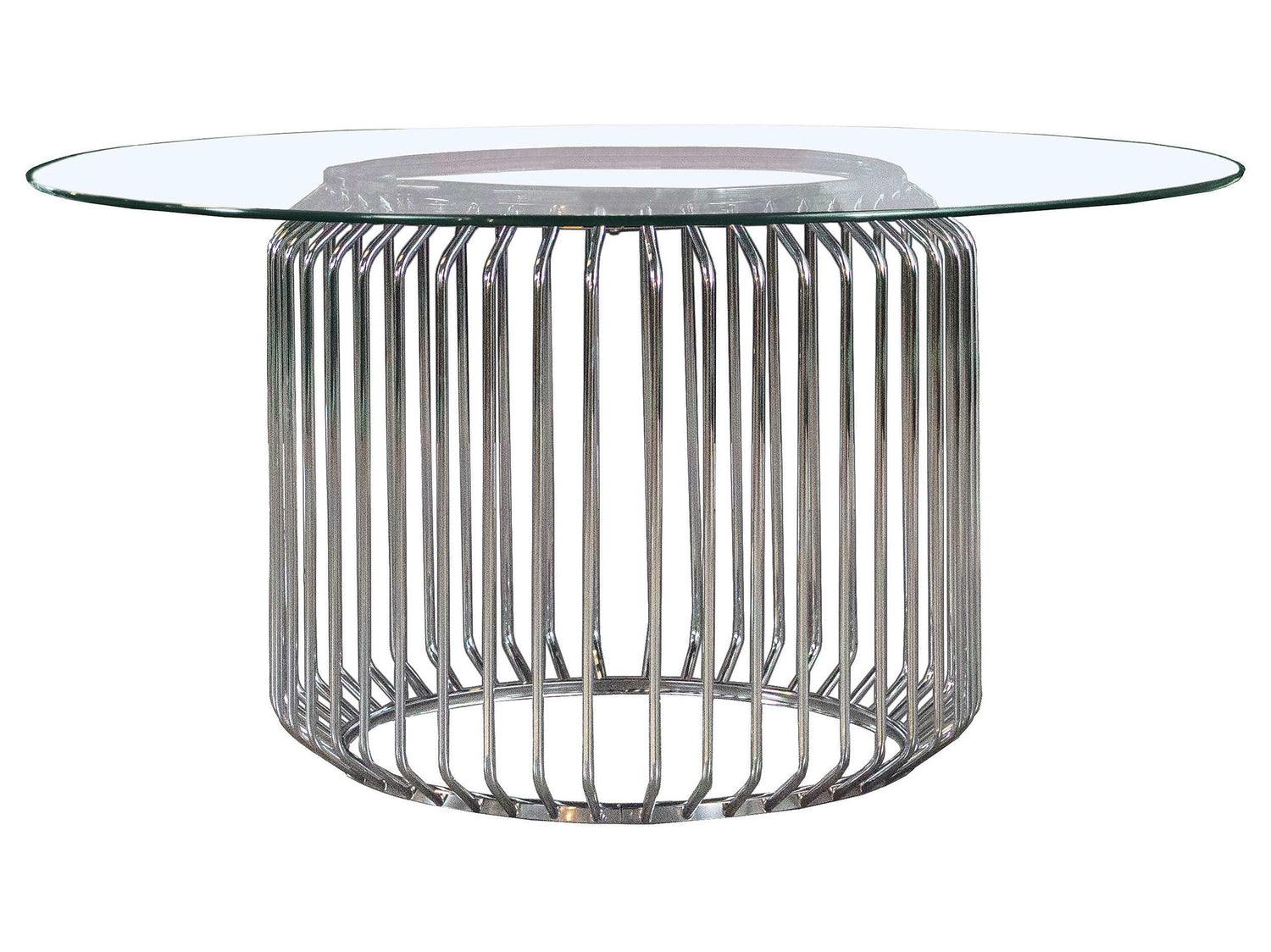 With a chic Art Deco vibe and retro-inspired flair, comes this modern dining table. Featuring a cylindrical shape surrounded by slim metal rods all around, this dining table base gives off a cage-like appearance and an open and airy style. With a lustrous polished chrome finish throughout, it opens itself up to existing color palettes, allowing you to play with tablescapes and seating as you wish. Crowned with a 60" round clear tempered glass top, this dining table will surely impress.