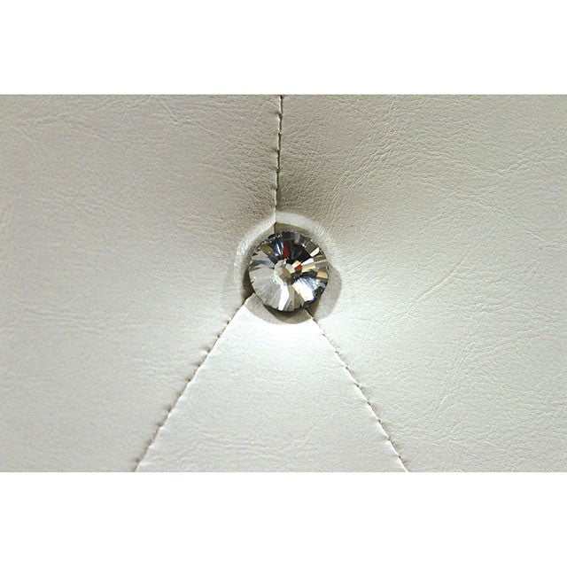This white padded leatherette bed helps bring about the beauty of this set. Crystal-like acrylic buttons adorn the tufting in the headboard, while matching case goods mirror the simplicity of the bed with straight lines and simple silhouettes. Available in five sizes.