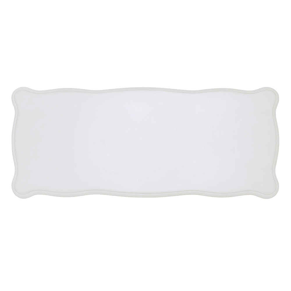 The rectangular shape of the Vendome sofa table offers a spacious surface for placing picture frames, books, and other items, making it a practical piece for your living space or entryway. Its versatile design complements a range of interior styles, from traditional to transitional. The shelf below the tabletop provides extra storage space for magazines or decorative items. The antique pearl white finish adds the perfect amount of vintage charm. Crafted with meticulous attention to detail, this sofa table seamlessly blends functionality with timeless aesthetics. The combination of the scrolled details and bun legs creates an eye-catching piece that exudes elegance and refinement.