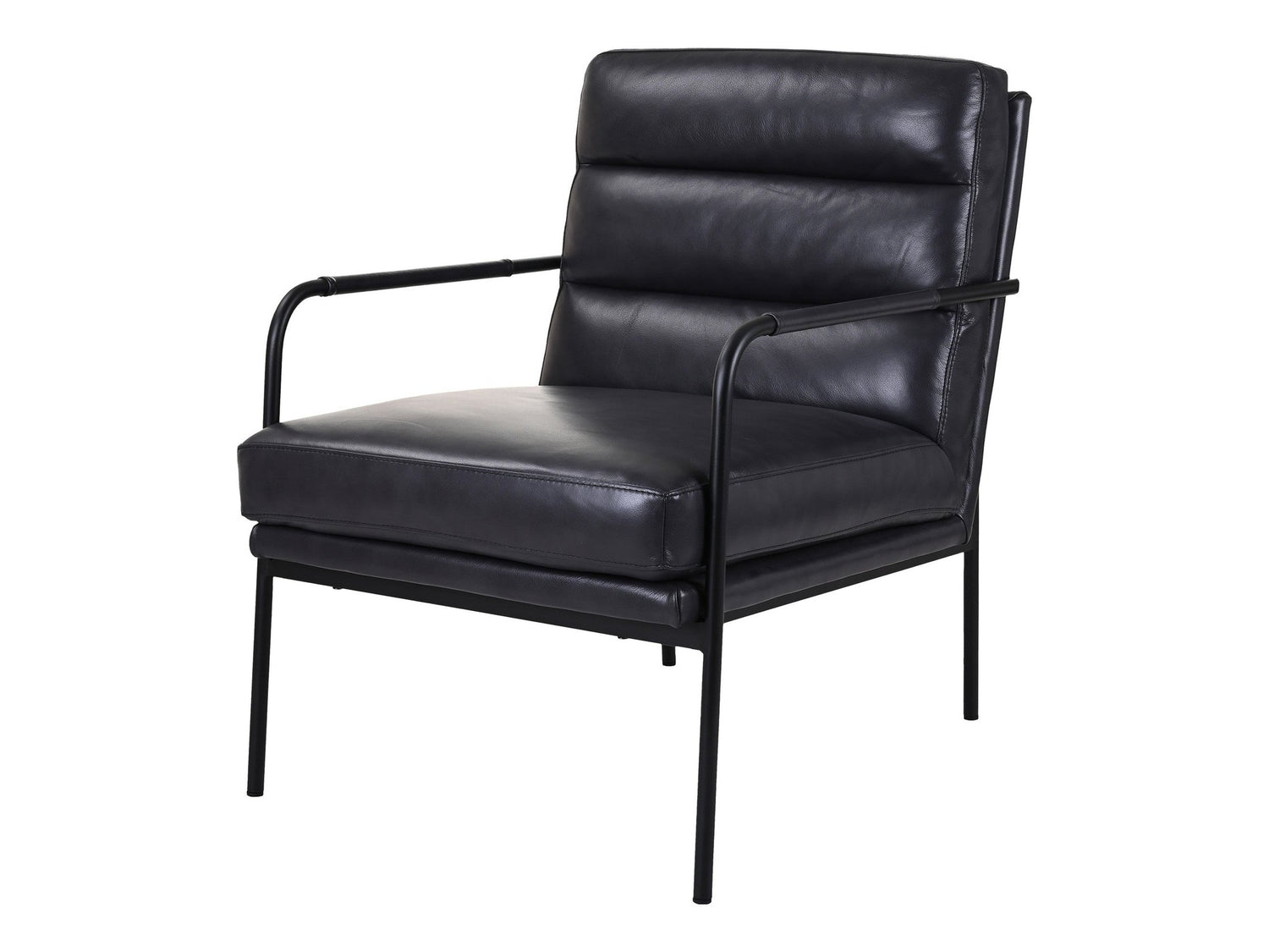 - Black top grain leather upholstery- A minimal, powder coated metal frame