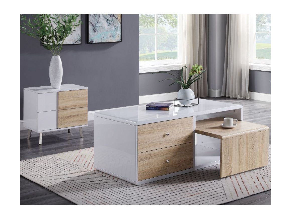 KD, Rectangular Coffee Table Storage: 4 Drw, Pull-Out Table Includes: High Gloss Case-Frame, Contrast Drawer Fronts & Pull-Out Table CONSTRUCTION Wooden Case-Frame: White High Gloss, MDF DRAWER & PULL Table) Wooden, Paper Veneer, MDF Drawer: GLIDE Side Metal (Full Ext.), DOVETAIL NOT Included, Fully Finished Inside (FELT-LINED NOT Included), Safety Stop Included, Manual Close, Hardware: Single Knob, Chrome Metal Finish Pull Table w/Metal Round Leg: Chrome Finish