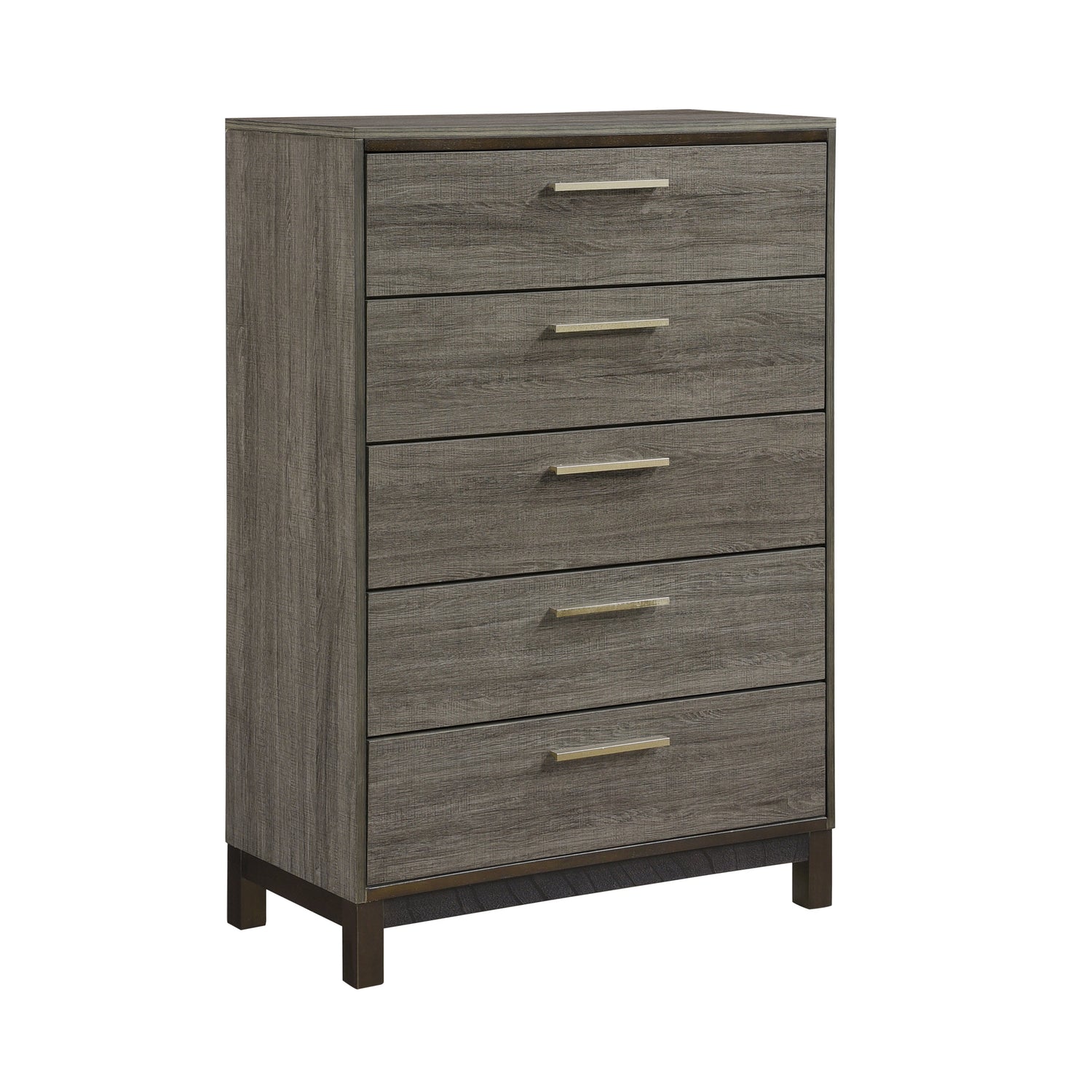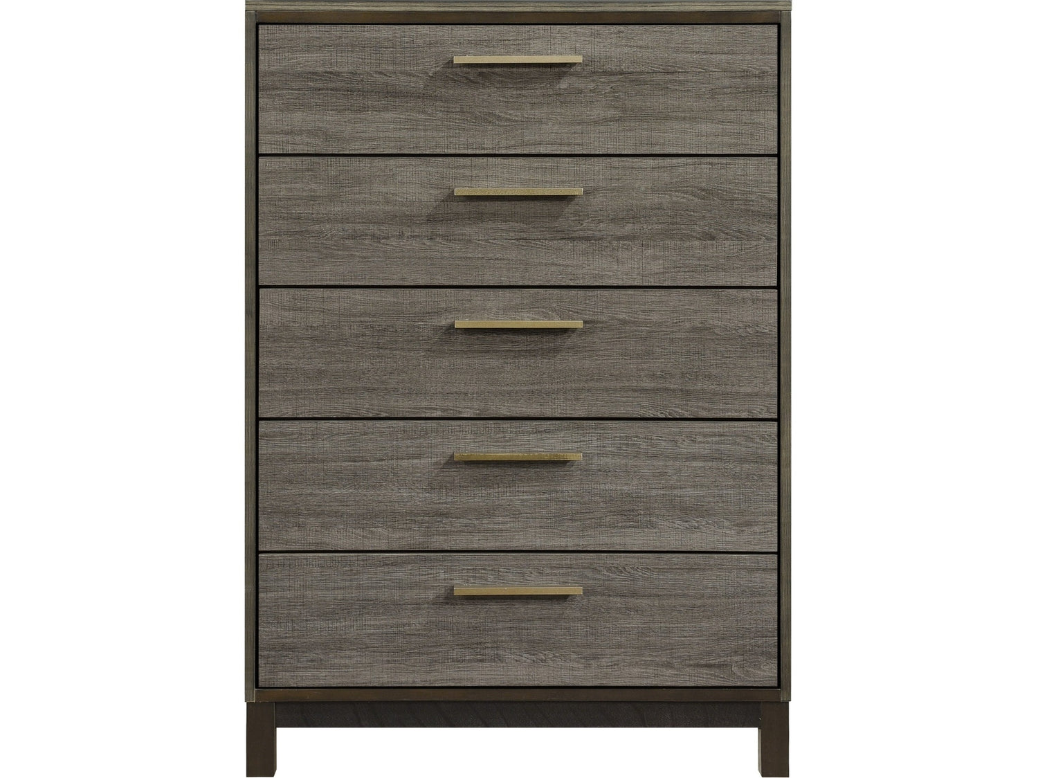 The contemporary styling of the Vestavia Collection provides a unique platform from which to redecorate your bedroom. Faux wood printed veneer provides subtle texture and a gray finish perfectly contrast the dark brown base rail of the chest. Clean lines lend to the angular modern look and are enhanced by the antique brass tone bar pulls.