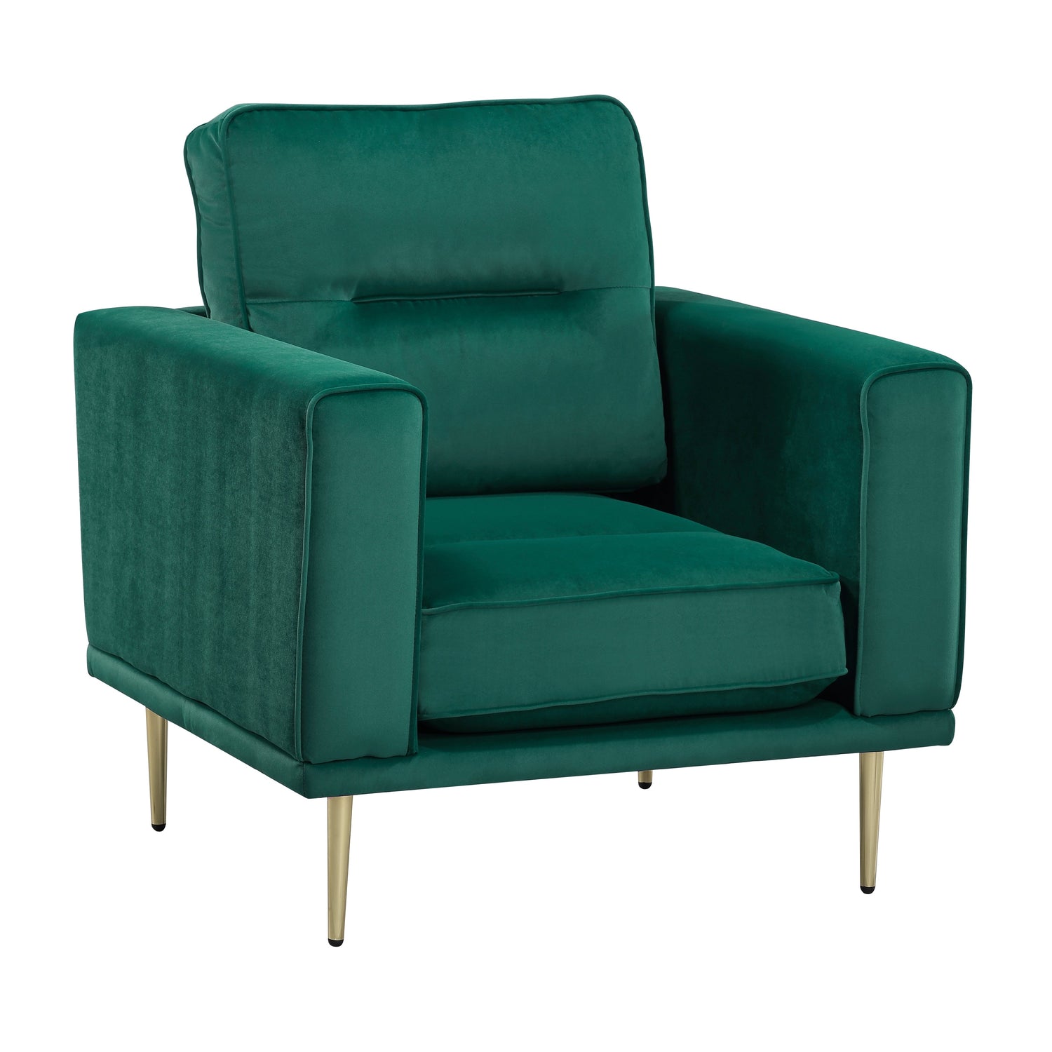 Modern lines, glamorous texture and exquisite style comprise the design of the Violetta Collection. Track style arms provide defining detail to the profile of the chair while gold finish metal legs lend support and stunning contrast. Green velvet fabric upholstery lends a soft touch to your seated experience, while reversible back cushions further the functionality of the collection.