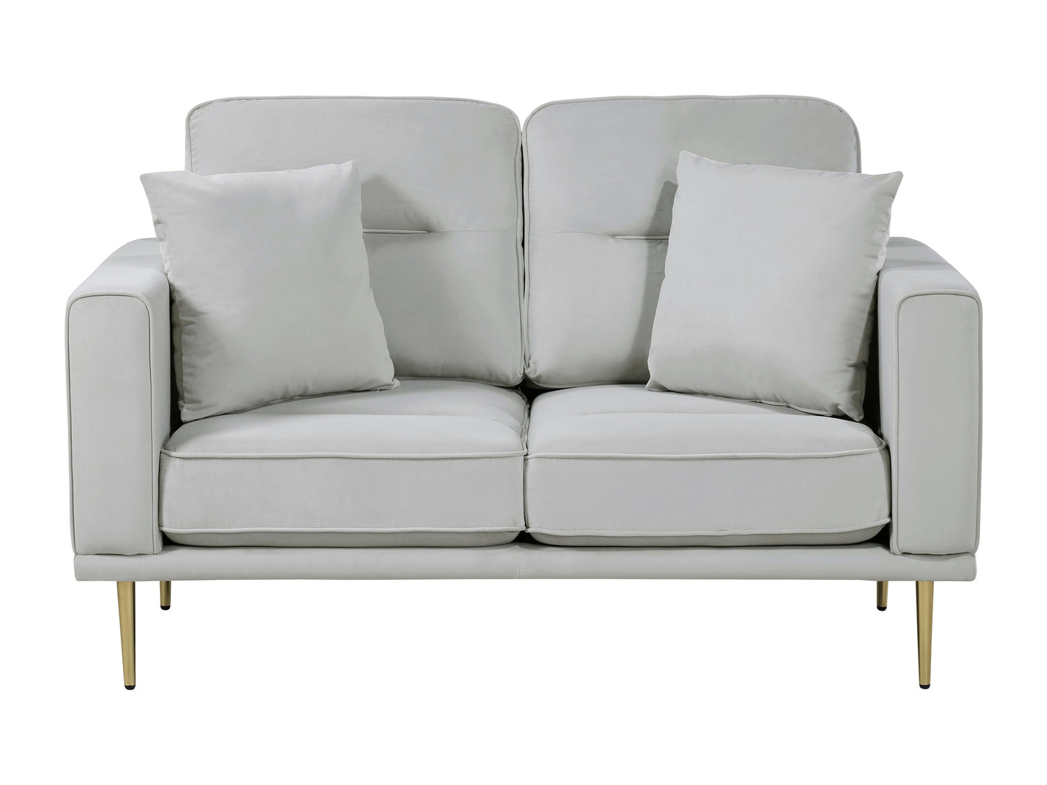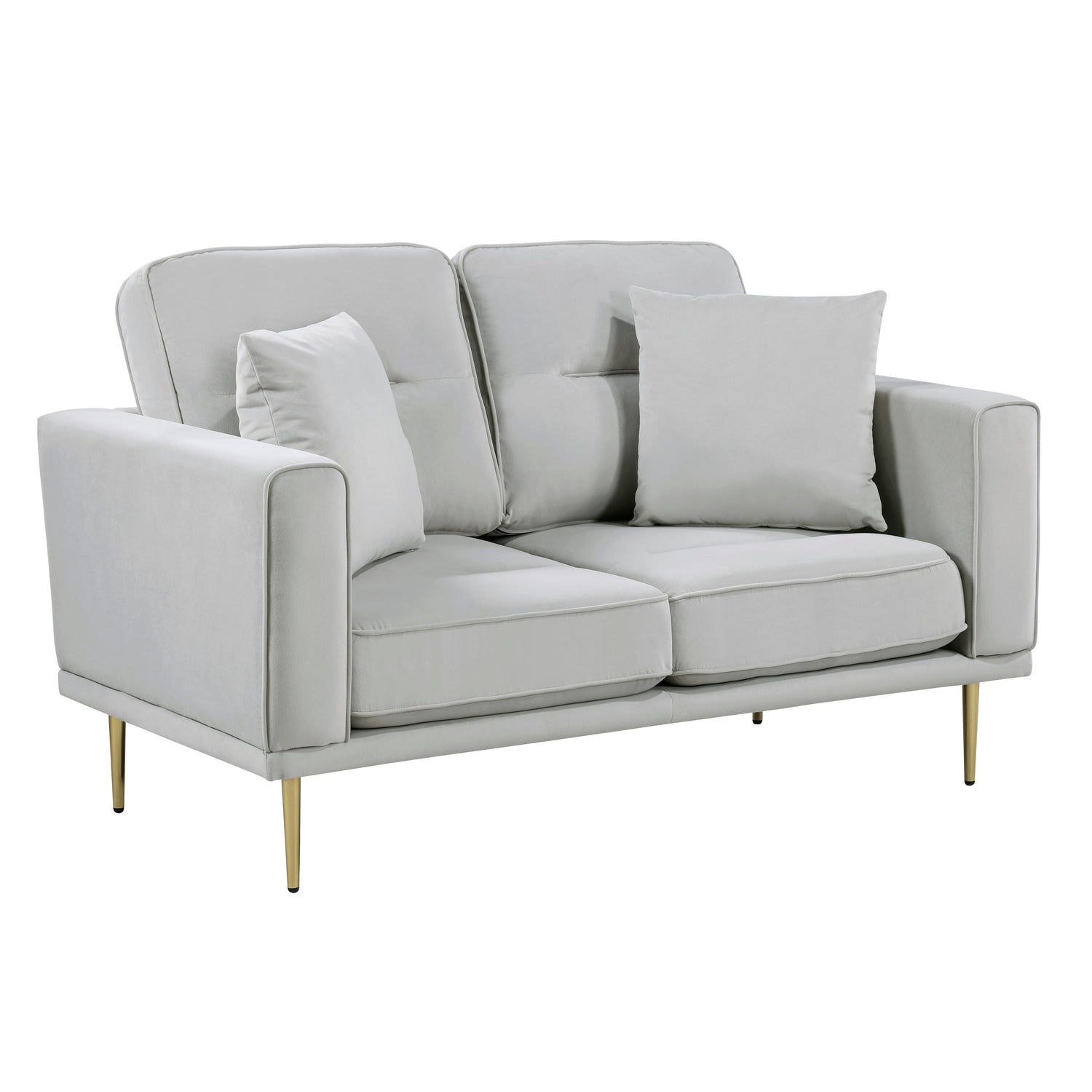 Modern lines, glamorous texture and exquisite style comprise the design of the Violetta Collection. Track style arms provide defining detail to the profile of the love seat while gold finish metal legs lend support and stunning contrast. Gray velvet fabric upholstery lends a soft touch to your seated experience, while reversible back cushions further the functionality of the collection.