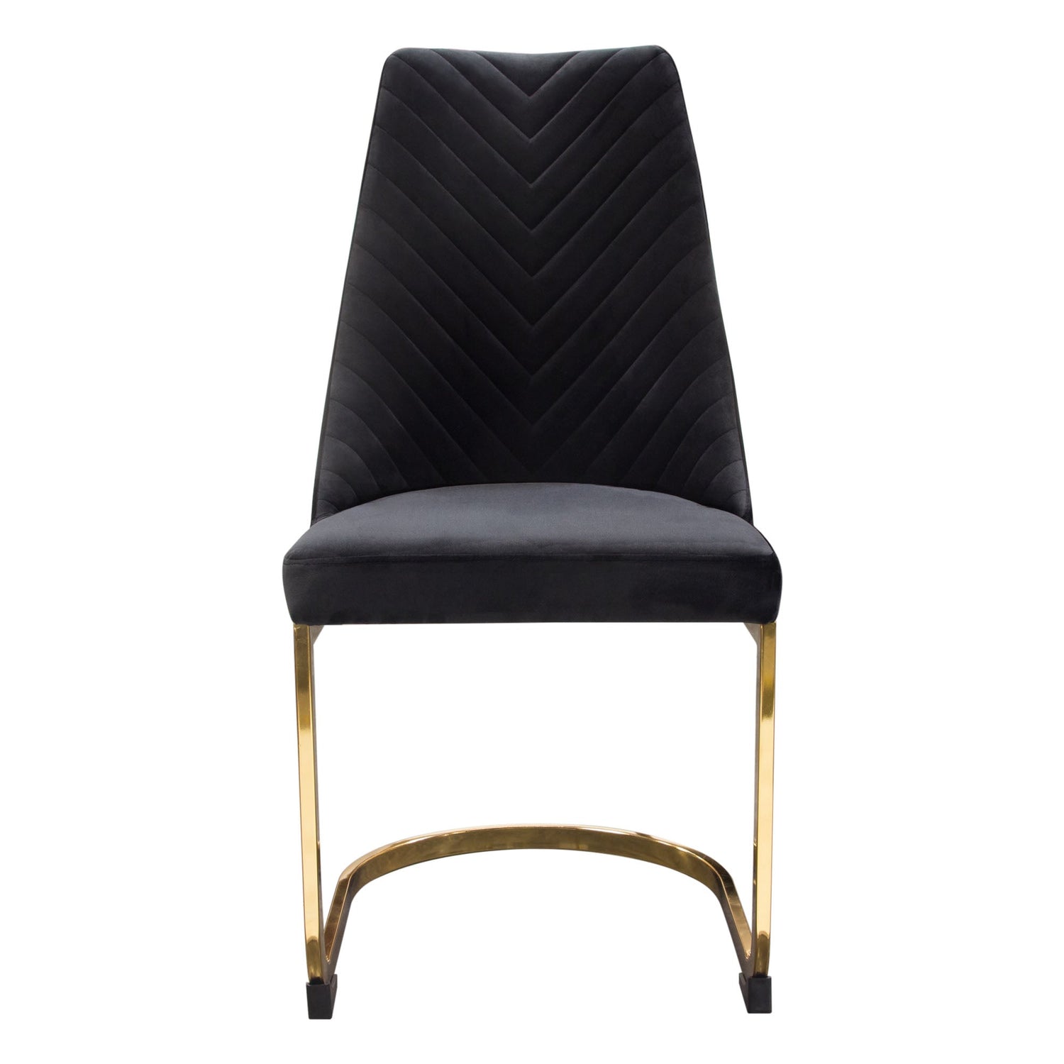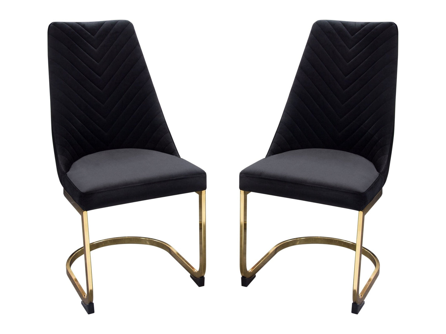 - The set includes (2) chairs, each piece featuring a polished gold stainless steel frame that supports a seat and back finished in a plush Black velvet with an exquisite 'V Tufted' design detail.