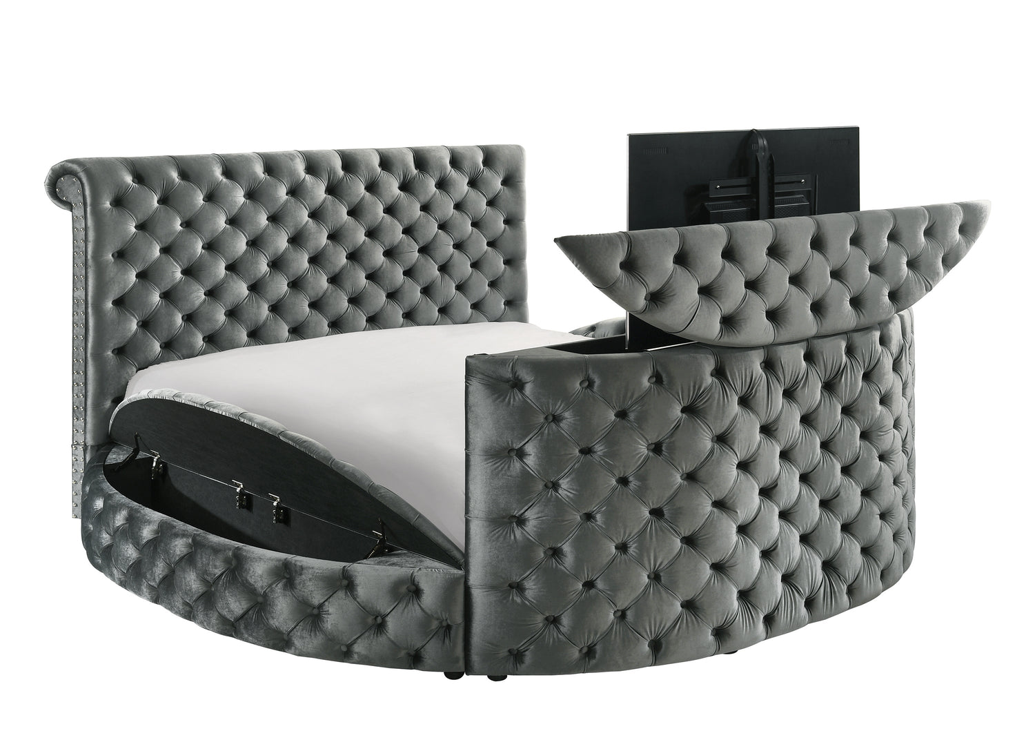 Indulge in the epitome of luxurious comfort and innovative design with this exquisite bed, a true masterpiece for those who appreciate both form and functionality in their sleeping quarters. Boasting a majestic, deeply tufted headboard with nail head trim, this bed is upholstered in sumptuous grey velvet, offering a touch of opulence to any bedroom setting. The footboard features an integrated television lift mechanism, seamlessly blending entertainment with relaxation. Additionally, a built-in electric fireplace enhances the ambiance and provides a cozy, warm glow that invites you to unwind in style. The bed’s innovative round design includes a practical storage system, discreetly hidden to maintain its sleek profile. This bed is perfect for those seeking a luxurious retreat that combines modern technology with sophisticated design elements to create an unparalleled bedroom experience.