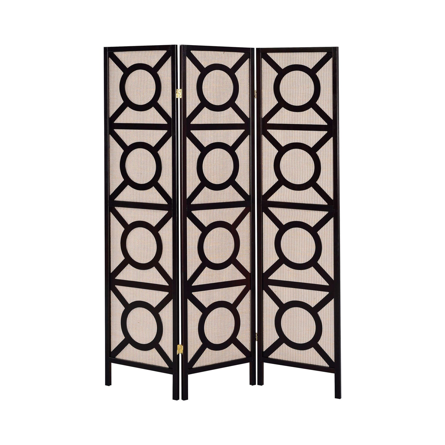 Riveting design detailing lends a dramatic effect. Make this three-panel folding screen a part of accent decor. Perfect for a transitional space, its open cutout design offers character and exotic charm. Circles and lines join to create an optically fun concept in a beautiful cappuccino and tan finish. Divide sections of a room or place in a corner as a decorative accent.