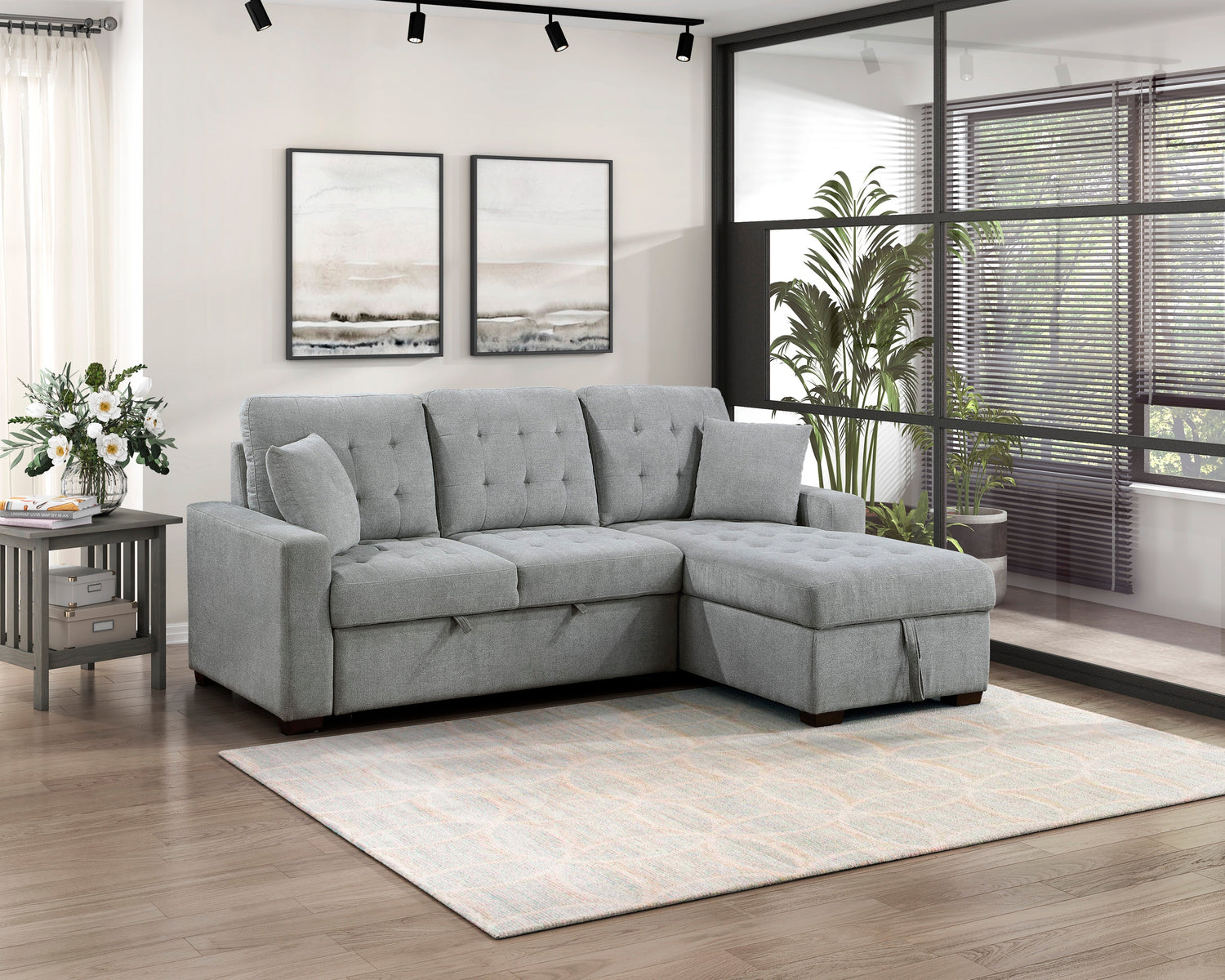 Expanding your seating area to include functional sleep space, the Waitsfield Collection is a versatile addition to your home. Gray textured fabric upholstery covers the sectional with stitch tufting lending a decorative touch. The left-side 2-seater features a pull-out bed while the right-side chaise has a lift-top hidden storage unit beneath the seating area.