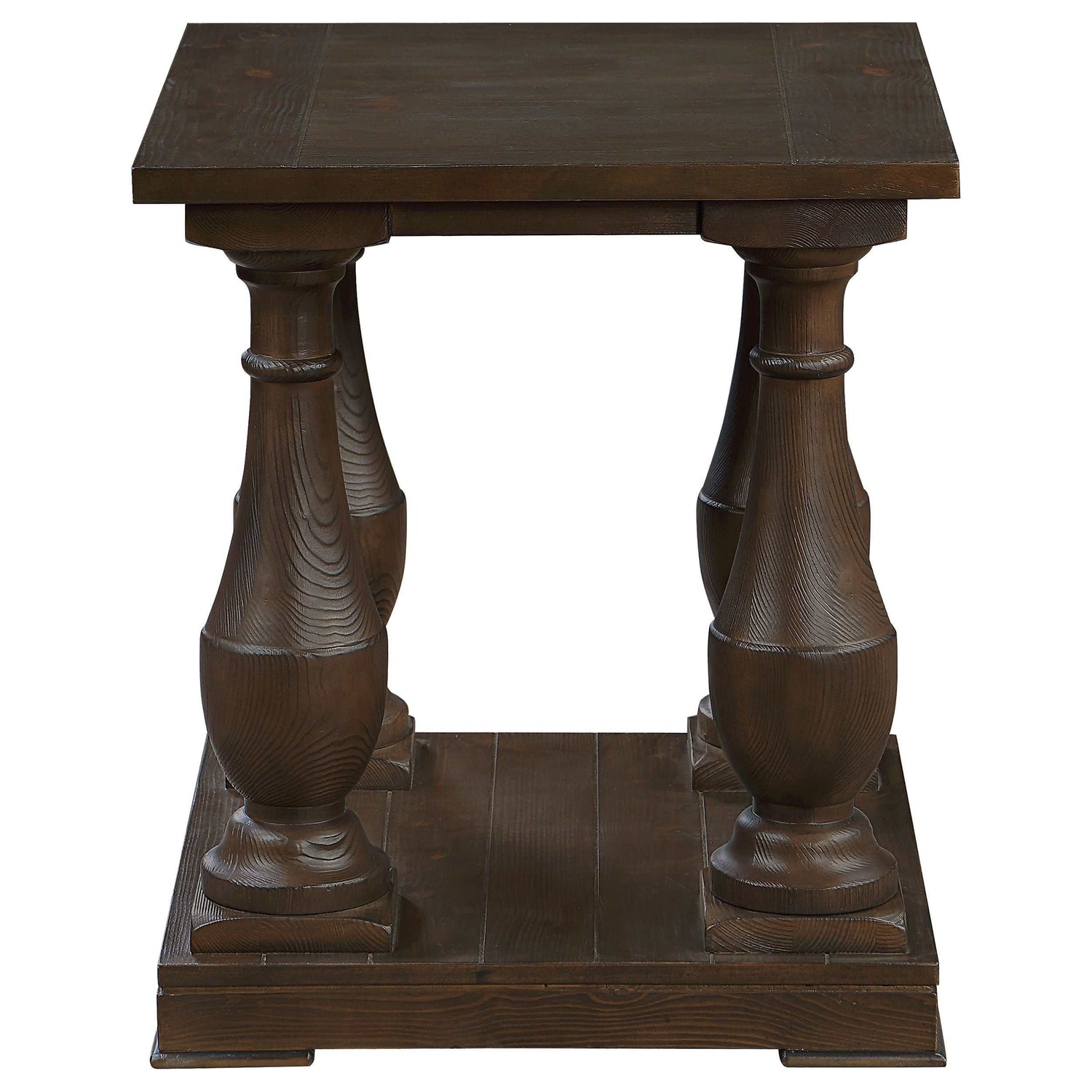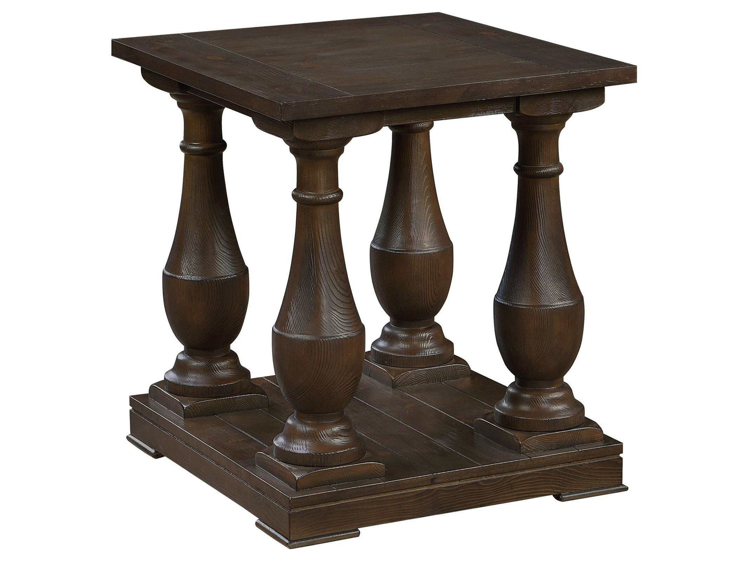 Classical silhouettes refine this transitional end table. Designed from a tropical wood material, this elegant end table offers a squared tabletop design lifted by four column-like turned pedestal legs for a timeless flair. With a plank design across the tabletop and the open bottom shelf, this end table offers up traditional touches. The deep, rich coffee brown finish also boasts a bold tone for refined, sophisticated homes and spaces. Place if aside a sofa or loveseat to keep a table lamp nearby and to showcase family photos and decor.