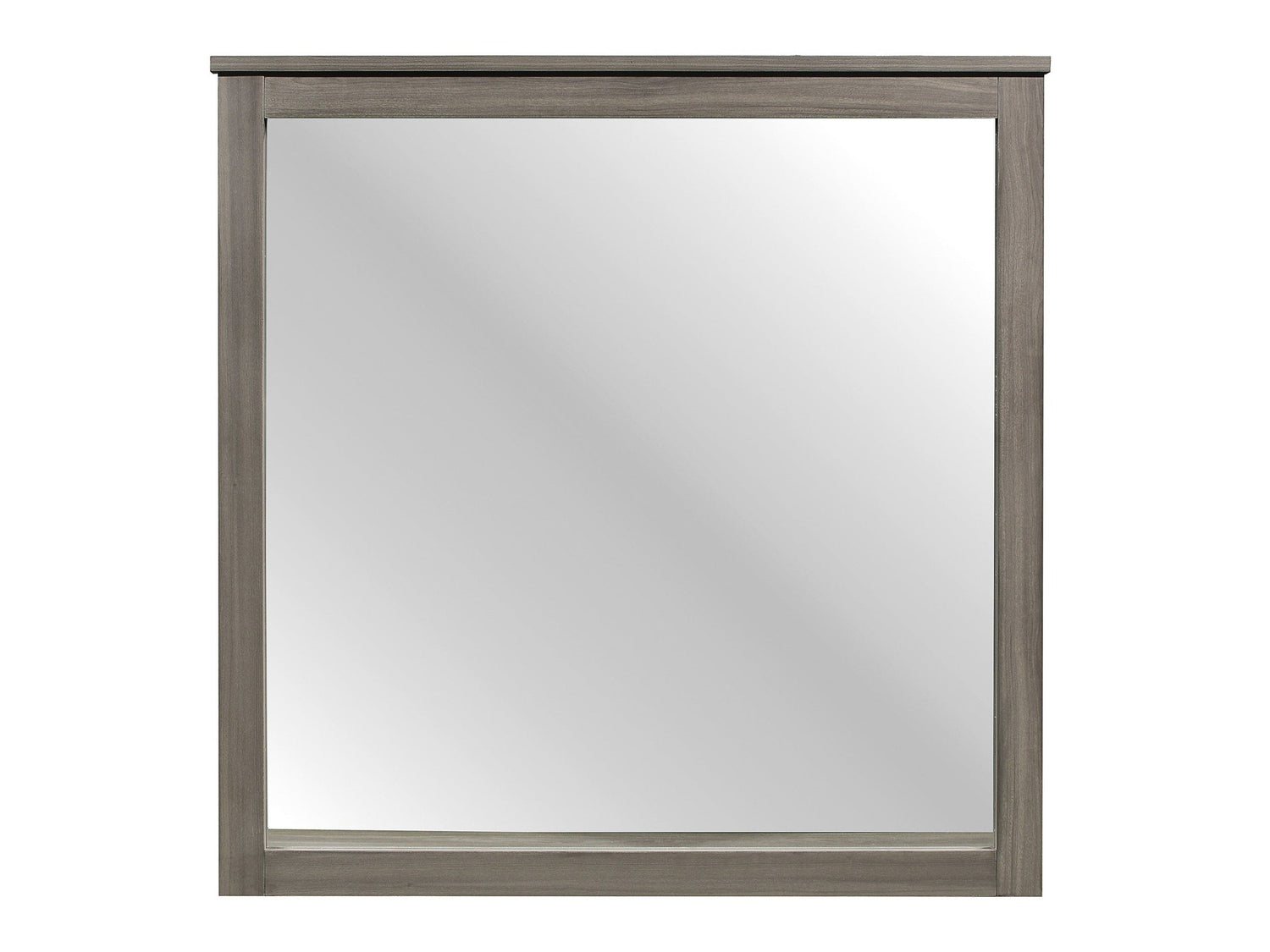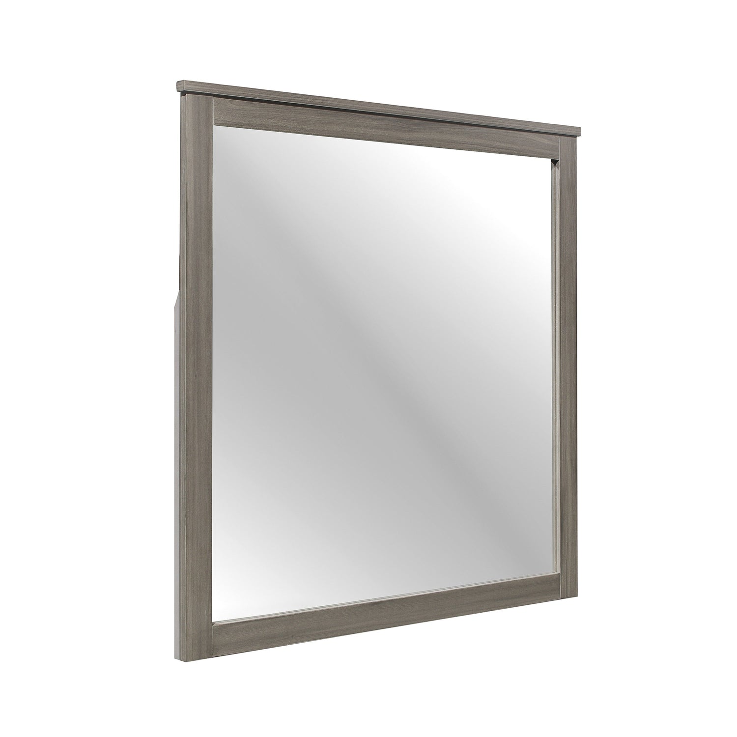 With a transitional look that lends to industrial, rustic and modern styling, the Waldorf Collection is a versatile choice for your bedroom. The mirror frame's printed wood grain performance laminate is featured in a gray tone allowing for neutral accent to your stylistic environmental choices.