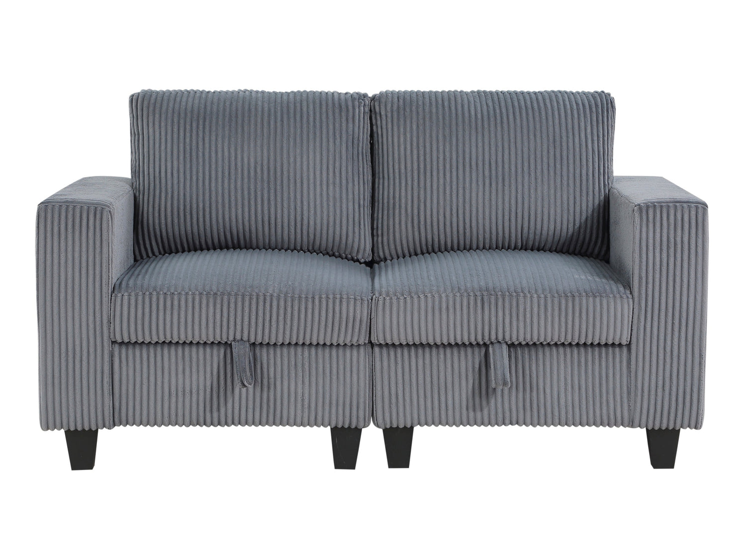 The multifunctional design of the Walterboro Collection creates a seating group that is not only configurable to your available space but serves as a convenient storage spot within your casual living room. Pull-out storage drawers are neatly tucked beneath the seats of the love seat, each drawer easily accessible with a pull to the front-mounted loop handle. The paired end seats arm's provide side support and power charging ports. The collection is covered in dark gray corduroy fabric for a neutral complement to your home’s décor.