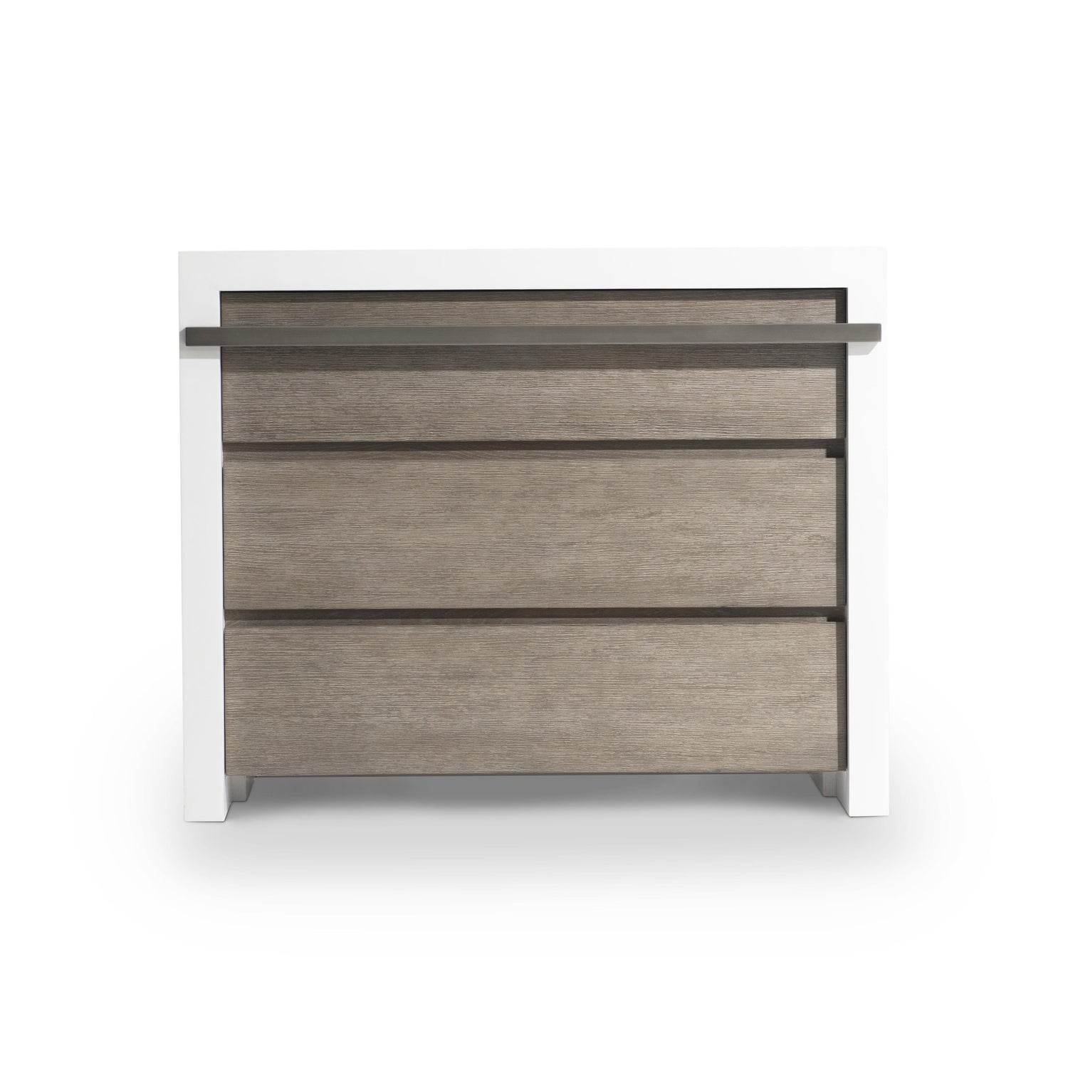 - Three soft-close drawers with stainless steel handle pull in Tarnished Nickel on top drawer and finger pulls on middle and bottom drawers