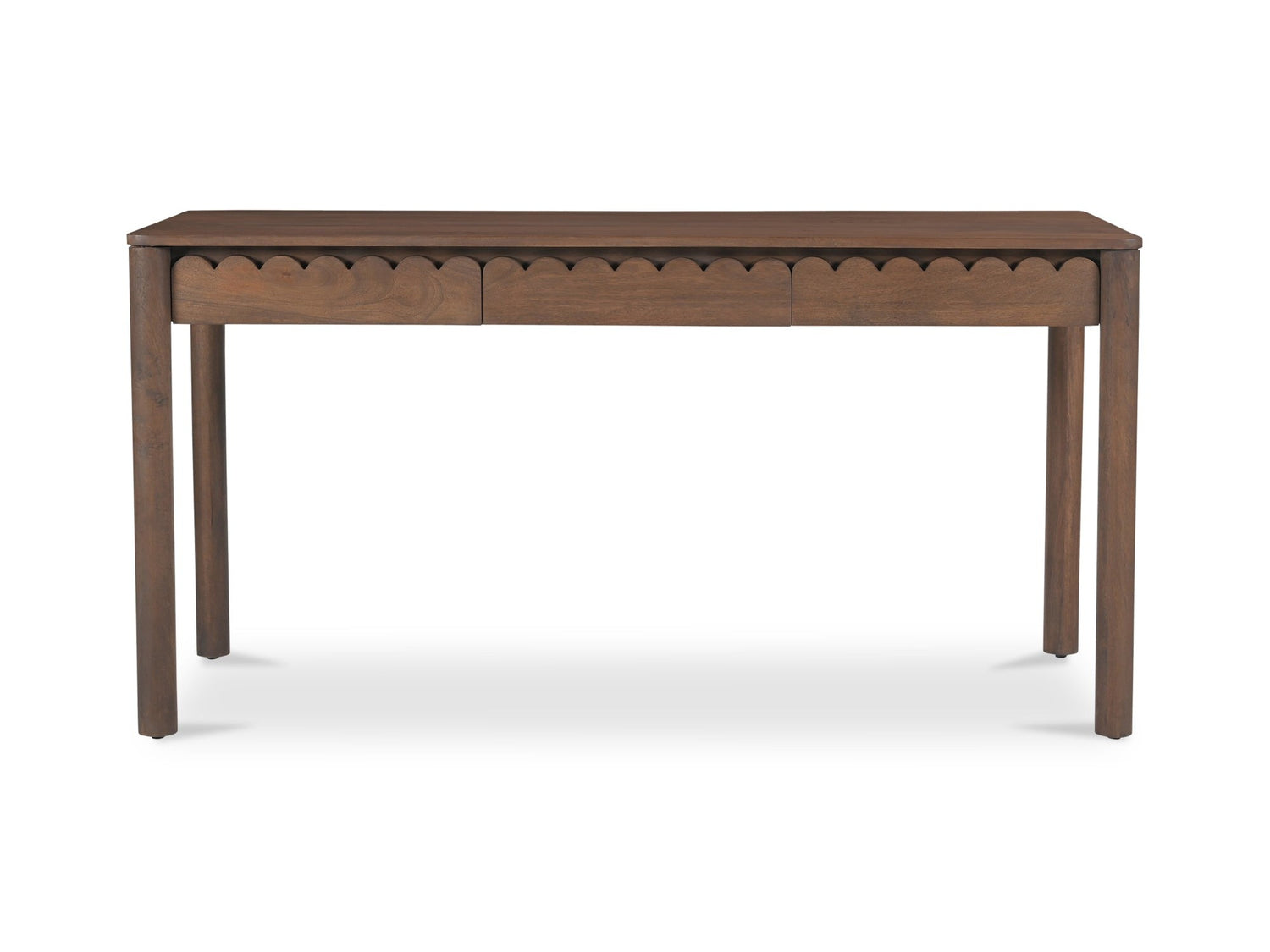 Modern aesthetics effortlessly blend with the refined simplicity of traditional Shaker design in the Wiley desk. Meticulously crafted, its elegant form is defined by sleek, geometric curves that add a captivating touch of modernity. The post legs stand as pillars of strength, grounding the desk with their understated presence. A showcase of intricate scalloped edge details to the faces of the three drawers lends a timeless charm reminiscent of classical influences.