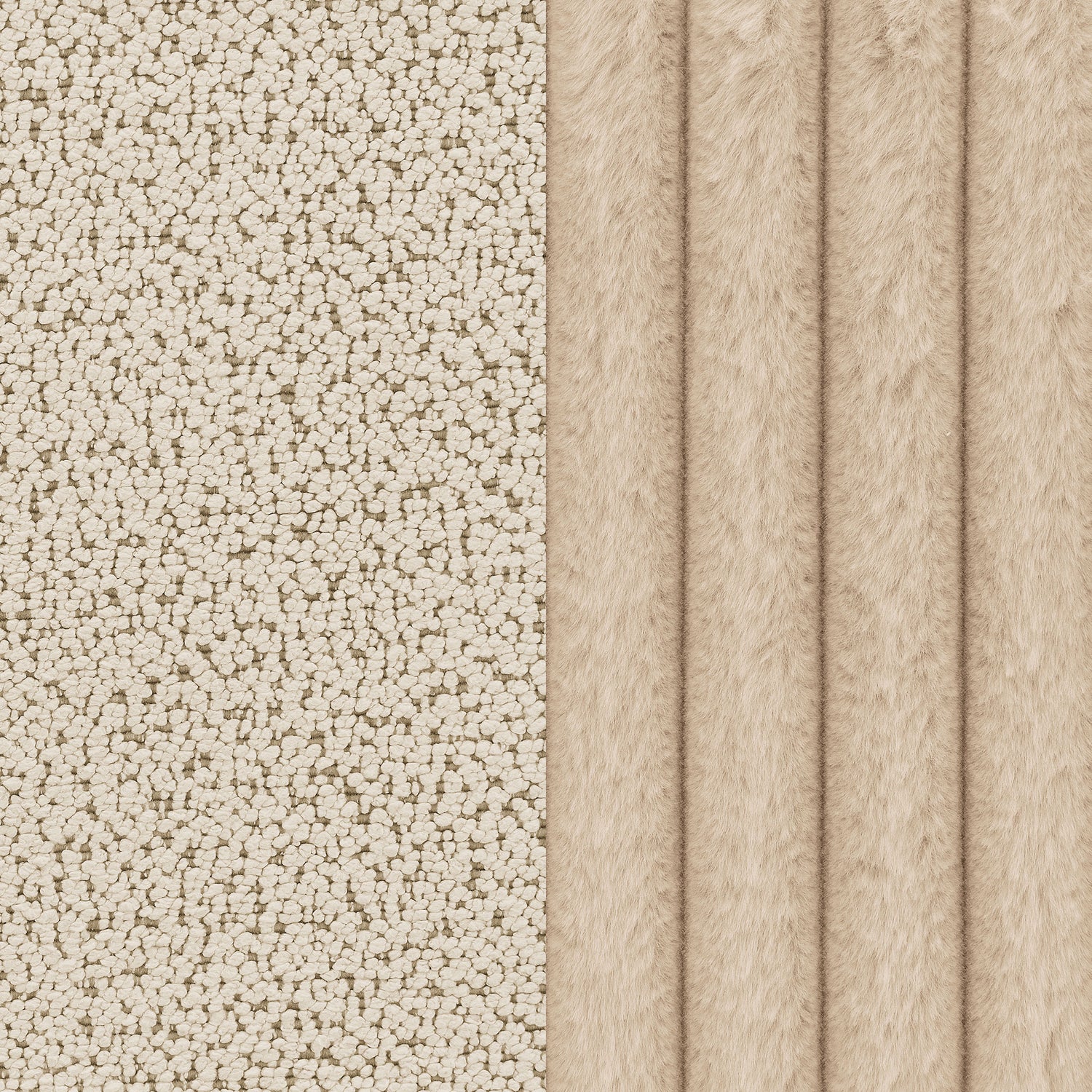 - Sand pebble boucle upholstery is soft and textured, with a neutral hue that adds warmth